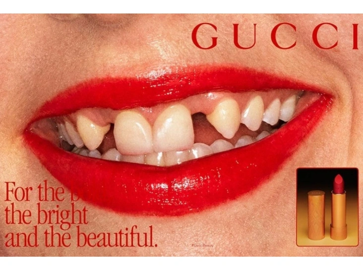 Gucci ошеломили общественность, позволив своей модели улыбнуться без стеснений. Томас де Клайвер – ведущий визажист Gucci Makeup – открыл всему миру неидеальную улыбку панк-певицы Дэни Миллер, которая не побоялась не только показать свое несовершенство, но и преподнести его как достоинство, сделав нужный акцент на губах с помощью красной помады. Так, коллекция помад Gucci становится дерзким оружием «реальных» женщин в решительной борьбе с нечеловеческими идеалами красоты.