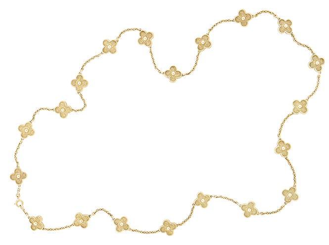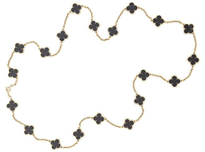 Сегодня, к 50-летию первого сотуара Alhambra, Van Cleef & Arpels представляет новые версии знаменитого украшения. Длинные колье, браслеты, серьги переливаются оттенками серого перламутра и сверкают бриллиантами, основой для которых станет розовое золото. Для тех, кто любит белое золото, есть длинное колье и браслет. Они тоже дополняются бриллиантами, но их блеск оттеняется черным сиянием оникса. Каждое из украшений — выгоднейшая инвестиция: ювелирные изделия, особенно из редких коллекций, не только не падают в цене, но и дорожают. Не это ли и есть удача?