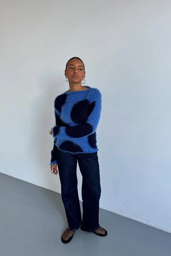 Стилизацию подсматриваем у лондонского бренда Molly O’Halloran — они первыми в этом сезоне обыграли polka dot в своих зимних вещах: свитерах, кардиганах и шарфах из мохера. Сочетайте гороховый трикотаж со штанами в тон: синий свитер — синие джинсы, черный кардиган — черные брюки. Так принт не будет сильно выбиваться из образа, но станет его главным акцентом (читайте также: Идеальная база — брюки на осень-зиму 2025/26: лучшие модели у российских брендов).