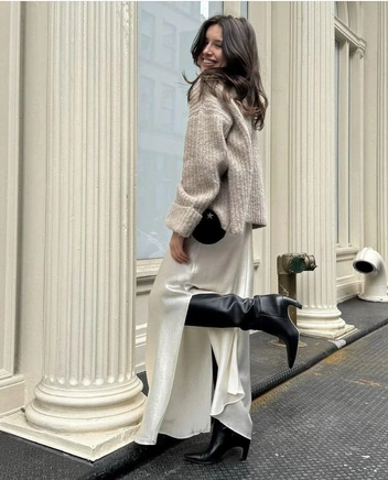 Главный секрет — в правильном балансе легкости и тепла. Сочетайте летние ткани, будь то шелк или кружево, с плотными зимними фактурами — кашемировыми свитерами, шерстяными юбками и длинными пальто. Так, атласное платье или юбку можно стилизовать с объемным оверсайз-свитером. Такая игра на контрастах и «сочетание несочетаемомго» — ключ к беспроигрышному внесезонному образу. А чтобы аутфит был не только модным, но и практичным, обязательно позаботьтесь о здоровье и наденьте термобелье и высокие сапоги (читайте также: Утепляемся: как выбрать термобелье на зиму — полный гид).