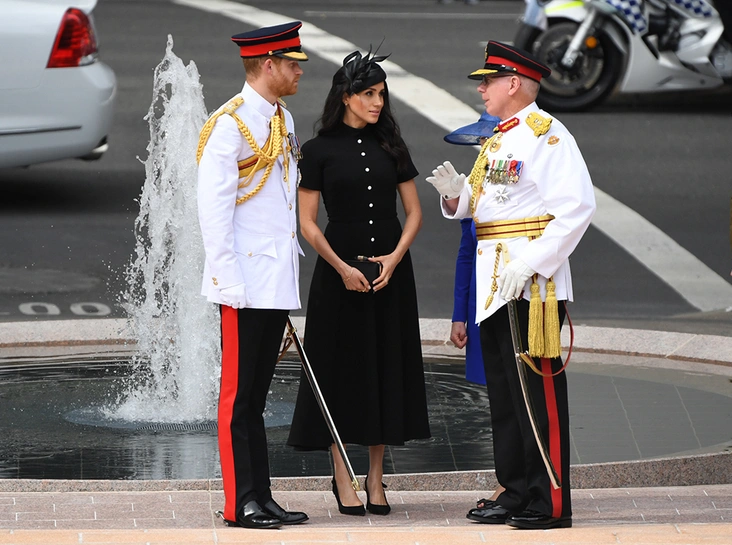 И, надо сказать, очаровываться этим утром было, с чего. Меган и Гарри, что называется, сыграли на контрасте. Принц прибыл на мероприятие в белом мундире офицера полка королевской конной гвардии Блюз энд Роялс, а Меган – в строгом черном платье Emilia Wickstead миди-длины с имитацией застежки на пуговицы от ворота до самого подола. Серьезность и официальность мероприятия, на котором также присутствовали высшие чиновники принимающей стороны, подчеркивала лаконичная черная шляпка от главного шляпника Ее Королевского Двора, Филипа Трейси. На ногах герцогини - туфли с открытой пяткой Tabitha Simmons.