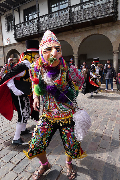 Это настоящие прохожие, не ряженые – приехали или на рынок, или на большой престольный праздник, которые в Куско отмечаются неделями. Сценарий веселья такой: деревенские в шляпах усаживаются на ступени собора, едят сами-понимаете-что и ждут, когда из церкви на огромных тяжеленных платформах мужчины начнут выносить святых (Писарро – один из них!) с атрибутами местной жизни и выгуливать их по улицам, а между святыми люди в костюмах и масках танцуют и стучат в барабаны. И так до ночи.