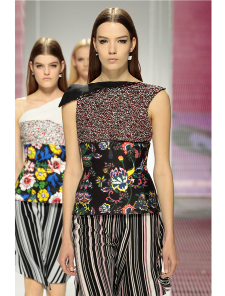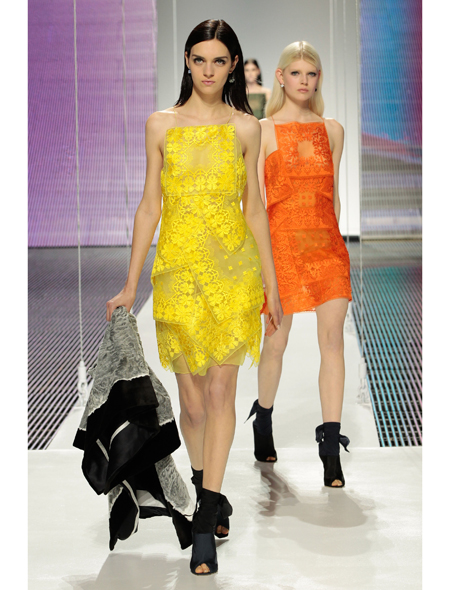 Сюда же можно отнести смелость при работе с мехом: сложные меховые макраме и юбку из черной норки. Да и само место проведения – это тоже новый уровень свободы и раскрепощенности. И вообще, сама тема – американский стиль – синоним свободы. Плюс свобода в широком смысле, то, как раскованно команда Рафа обращается с элементами истории Dior, всеми этими жакетами Bar, цветочными принтами, широкими юбками, переводя их в современную плоскость, добавляя к ним лазерную перфорацию, асимметричный крой и полоски – намек на американский флаг.