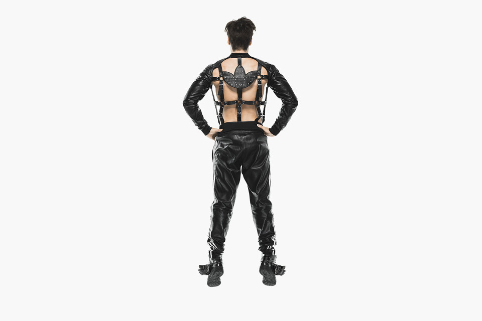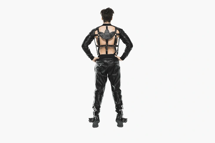 Фото одного из образов также выложил манекенщик Пабло Лиа (Pabloo Lea): на нем он одет в кожаную куртку с бондажом вместо передней и задней части.