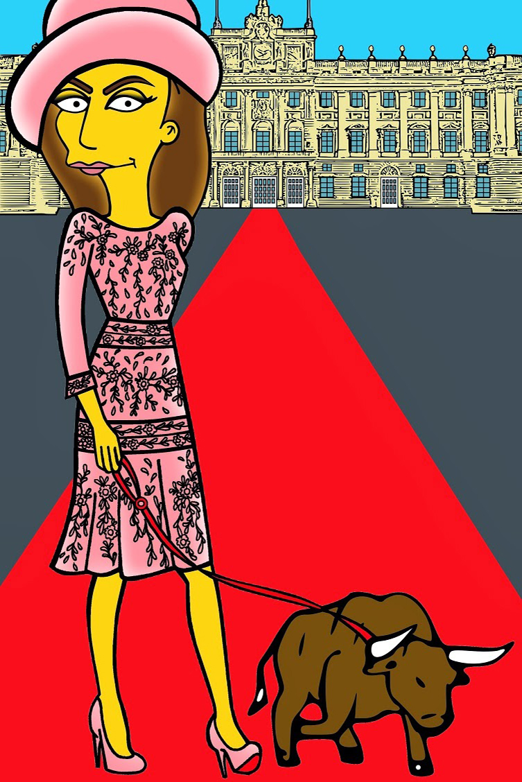 На одной из картинок испанская королева в полной парадной военной форме сидит верхом на быке, а на другой в розовом платье и шляпе выгуливает небольшого быка на поводке.