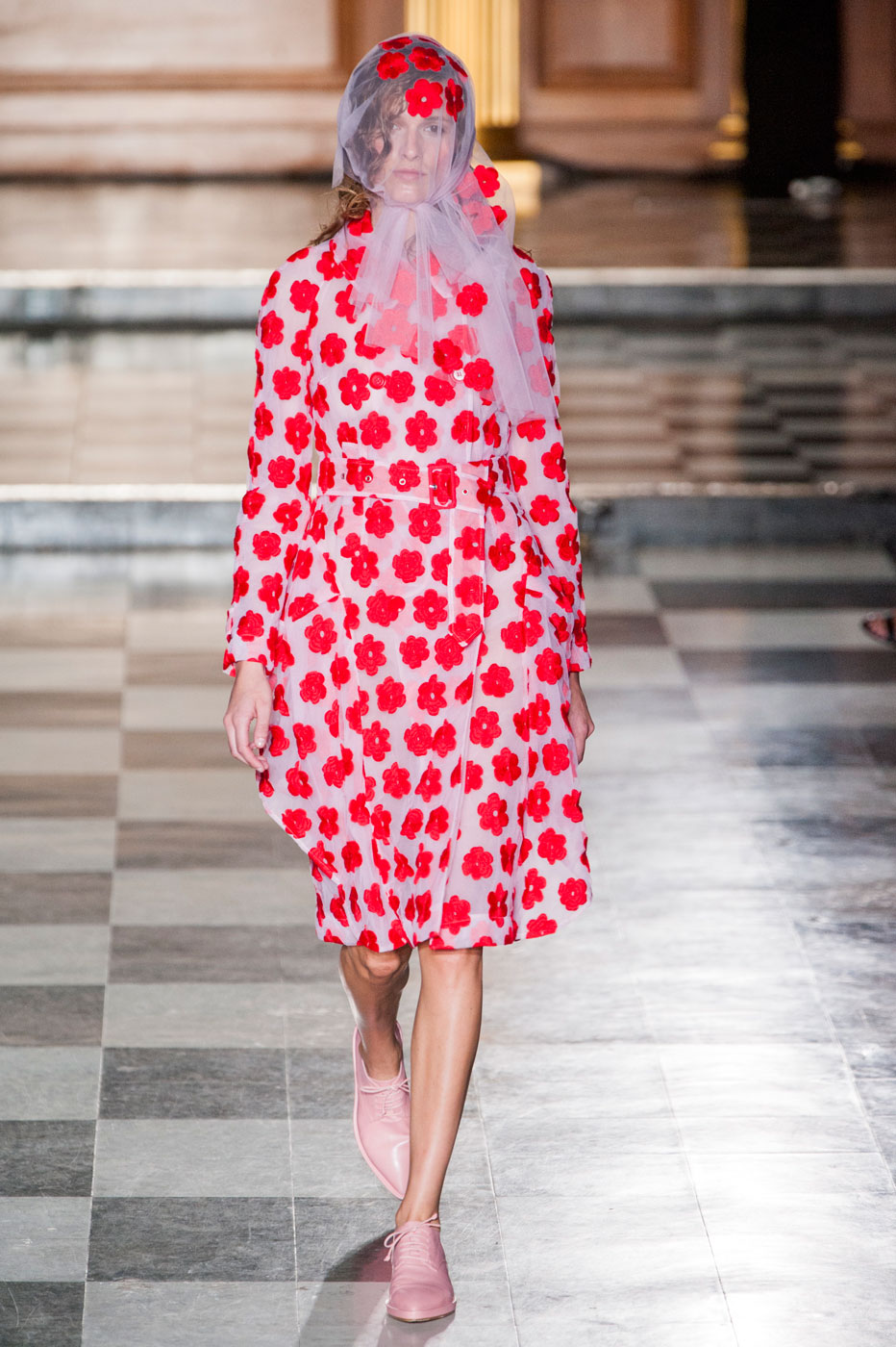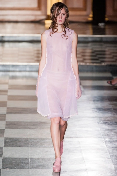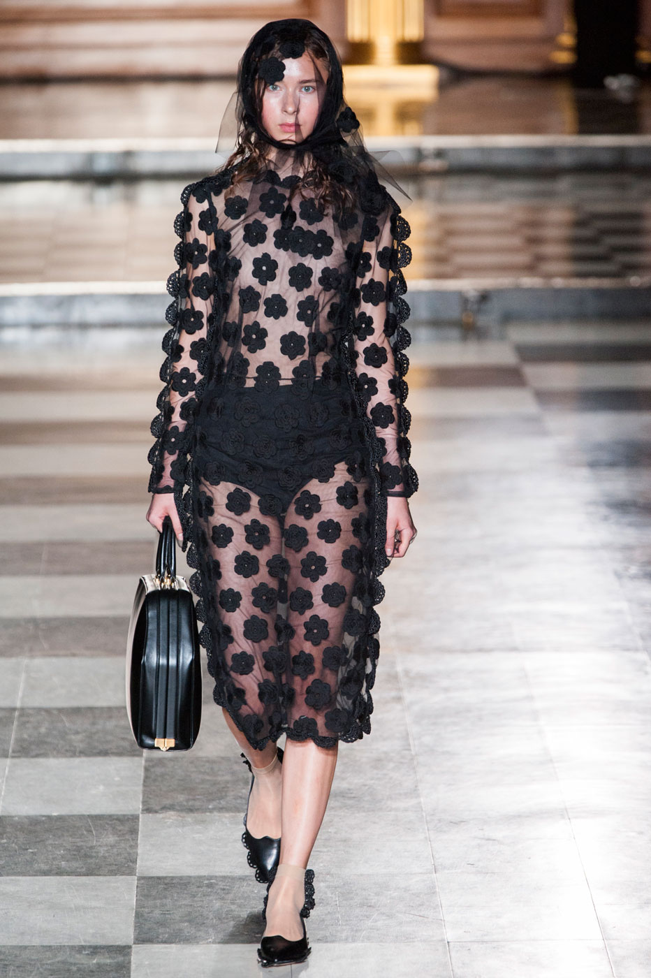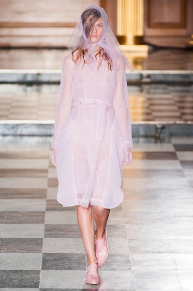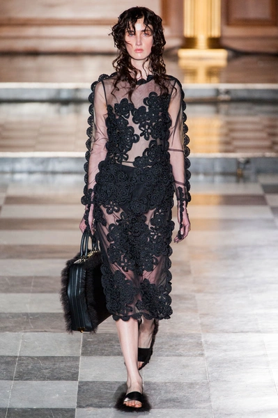 В ее воздушной коллекции девушки ходят в прозрачных плащах, платьях из тюля и таких же легких костюмах персикового цвета. Затем появляются наряды, сделанные словно из старинных тканых обоев, которые украшали стены дворцов. Только декорирующие их цветы не просто нарисованы на ткани – они выходят за ее пределы и образуют 3D-эффект. В коллекции Simone Rocha повторяется общий тренд многих показов в Нью-Йорке и Лондоне – прозрачная ткань, открывающая грудь. Она есть даже в нарядах, напоминающих платья сицилийских вдов: черные костюмы с фактурными краями, черные платья с нашитыми цветами и непременно – прозрачная косынка, покрывающая голову.
