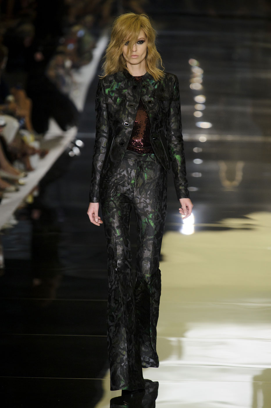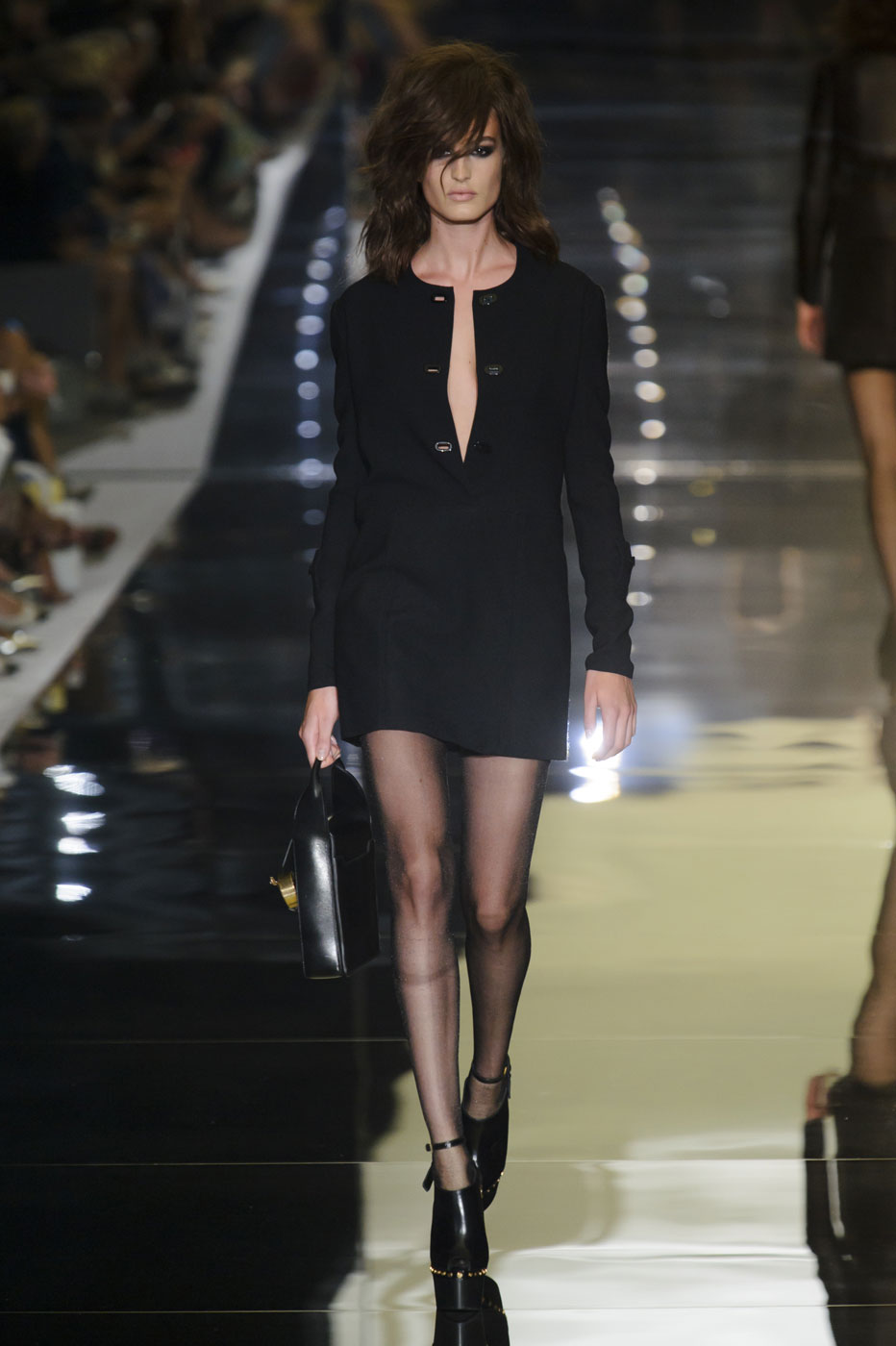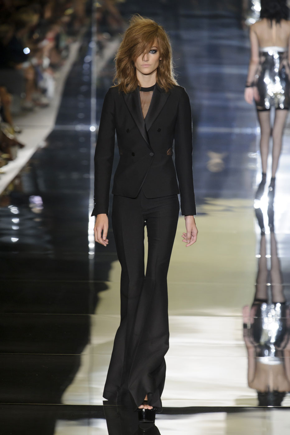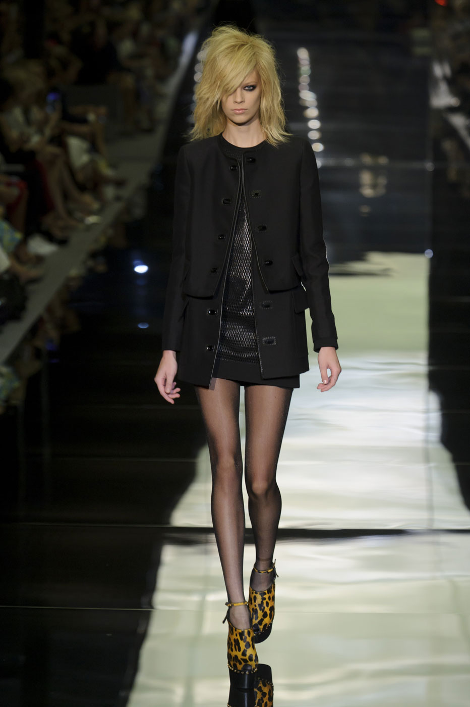 Том Форд решил избежать цветочных принтов и ярких красок, представив весеннюю коллекцию в рок-н-ролльных и глэм-рокерских темных оттенках. По первому впечатлению можно подумать, что это девушки Эди Слимана, но Том Форд пояснил, что вдохновлялся собственным дизайном поздних 90-х. В его коллекции – жакеты, кожаные платья, брюки, блестящие водолазки и ультракороткие платья на тонких бретельках с прозрачной тканью на груди. В качестве цензуры поверх просвечивающегося материала нашиты цветы, похожие на астры, сделанные словно из мишуры, – единственная отсылка к весенне-летнему сезону.
