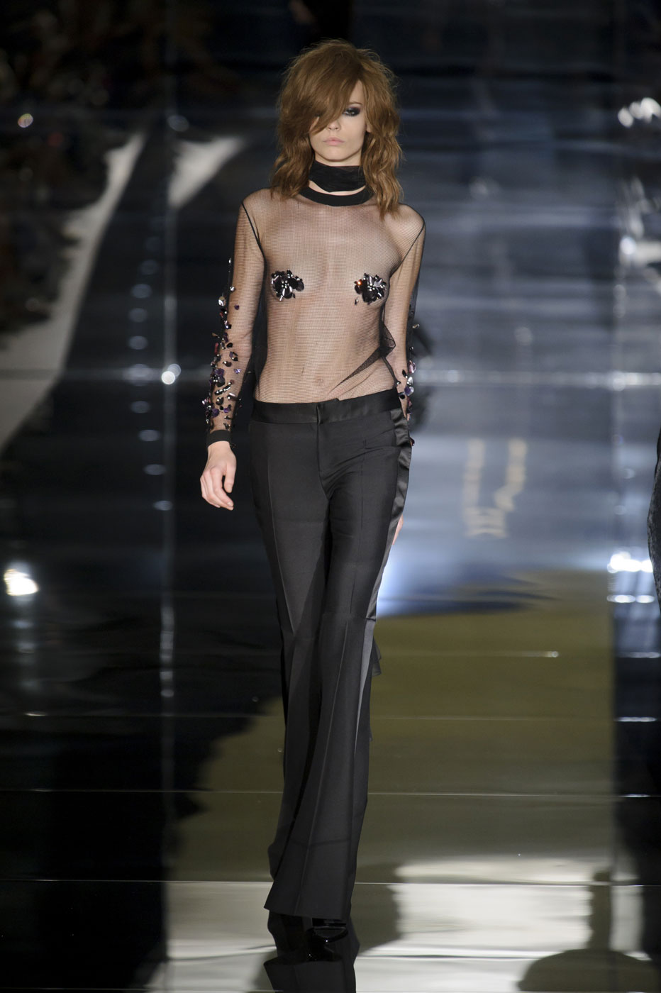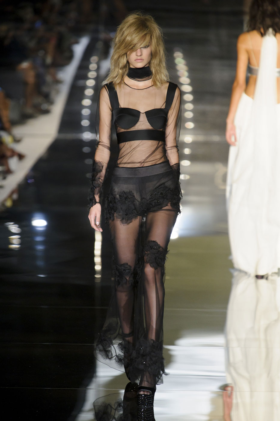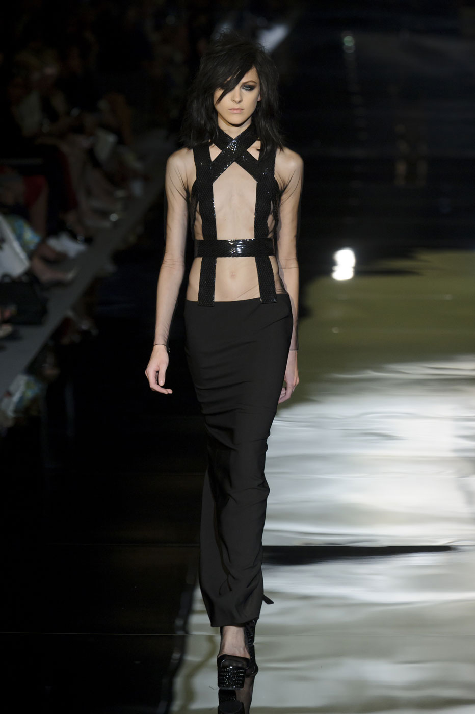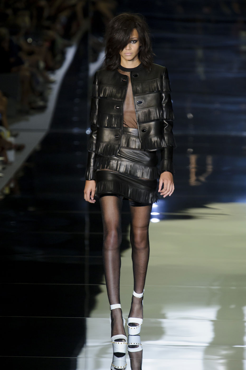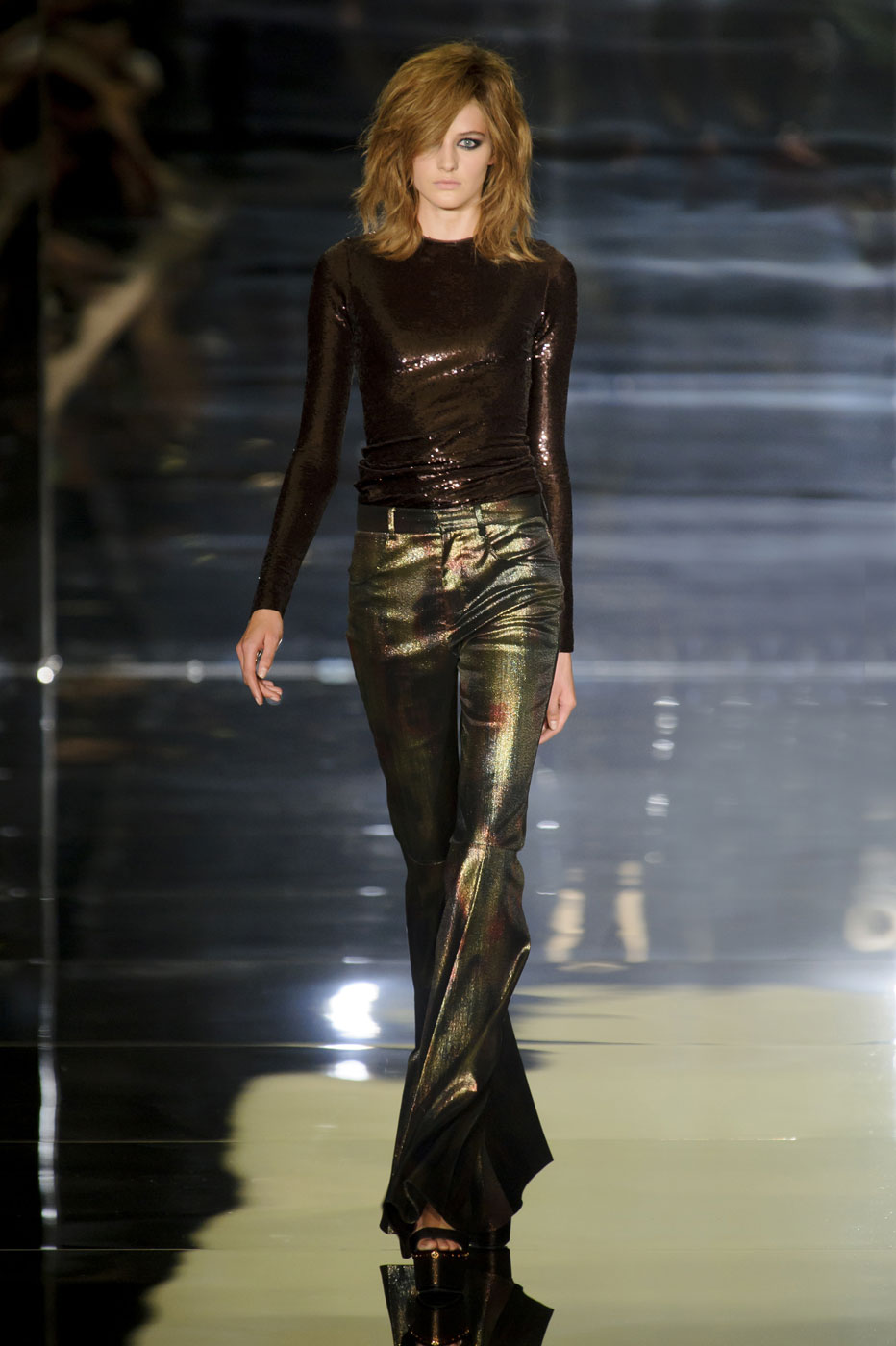 Том Форд решил избежать цветочных принтов и ярких красок, представив весеннюю коллекцию в рок-н-ролльных и глэм-рокерских темных оттенках. По первому впечатлению можно подумать, что это девушки Эди Слимана, но Том Форд пояснил, что вдохновлялся собственным дизайном поздних 90-х. В его коллекции – жакеты, кожаные платья, брюки, блестящие водолазки и ультракороткие платья на тонких бретельках с прозрачной тканью на груди. В качестве цензуры поверх просвечивающегося материала нашиты цветы, похожие на астры, сделанные словно из мишуры, – единственная отсылка к весенне-летнему сезону.