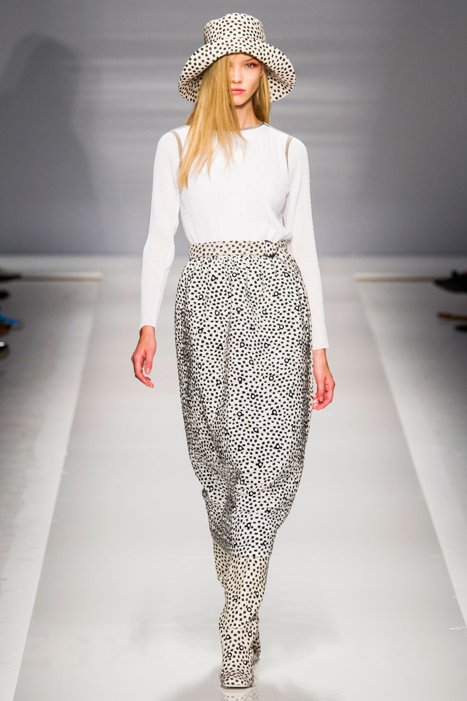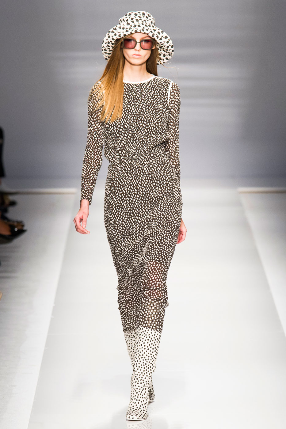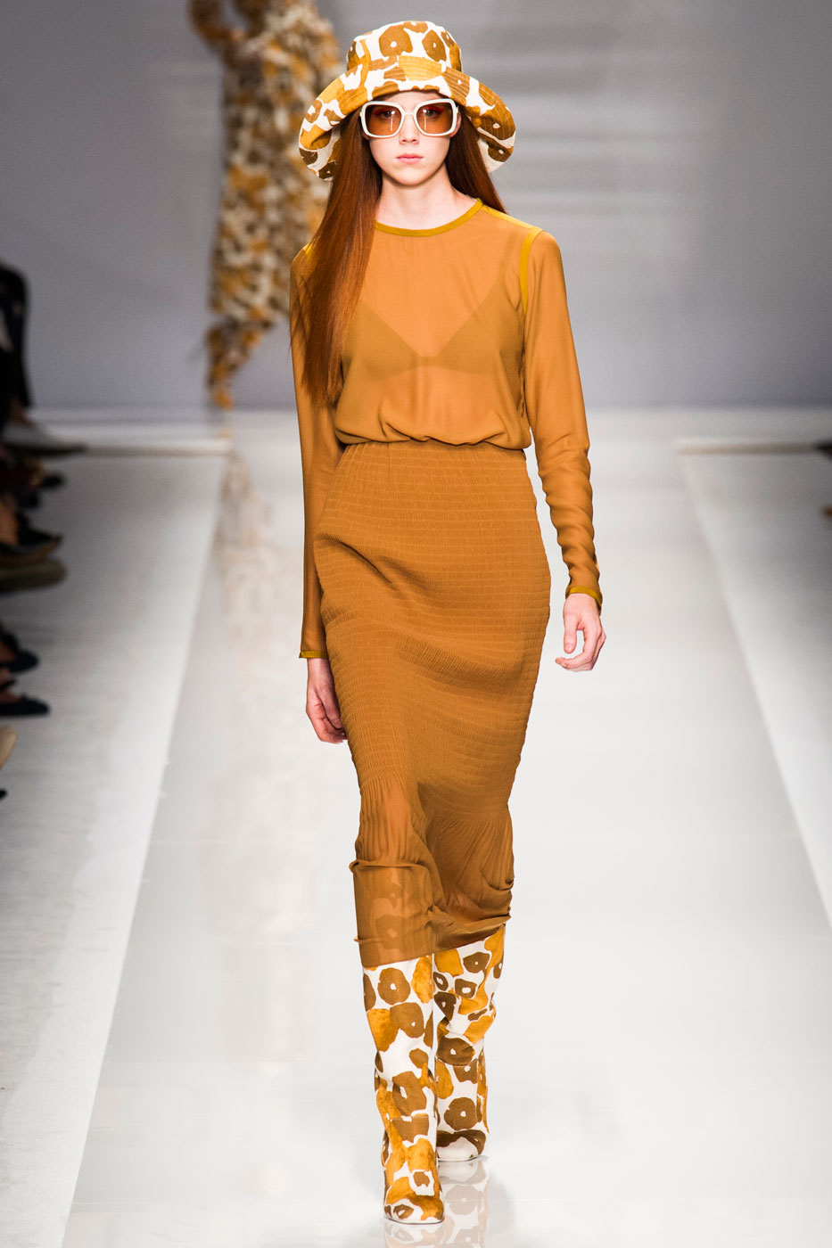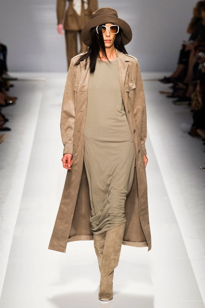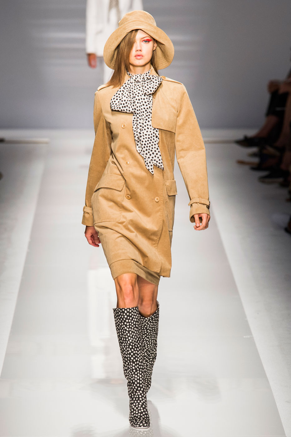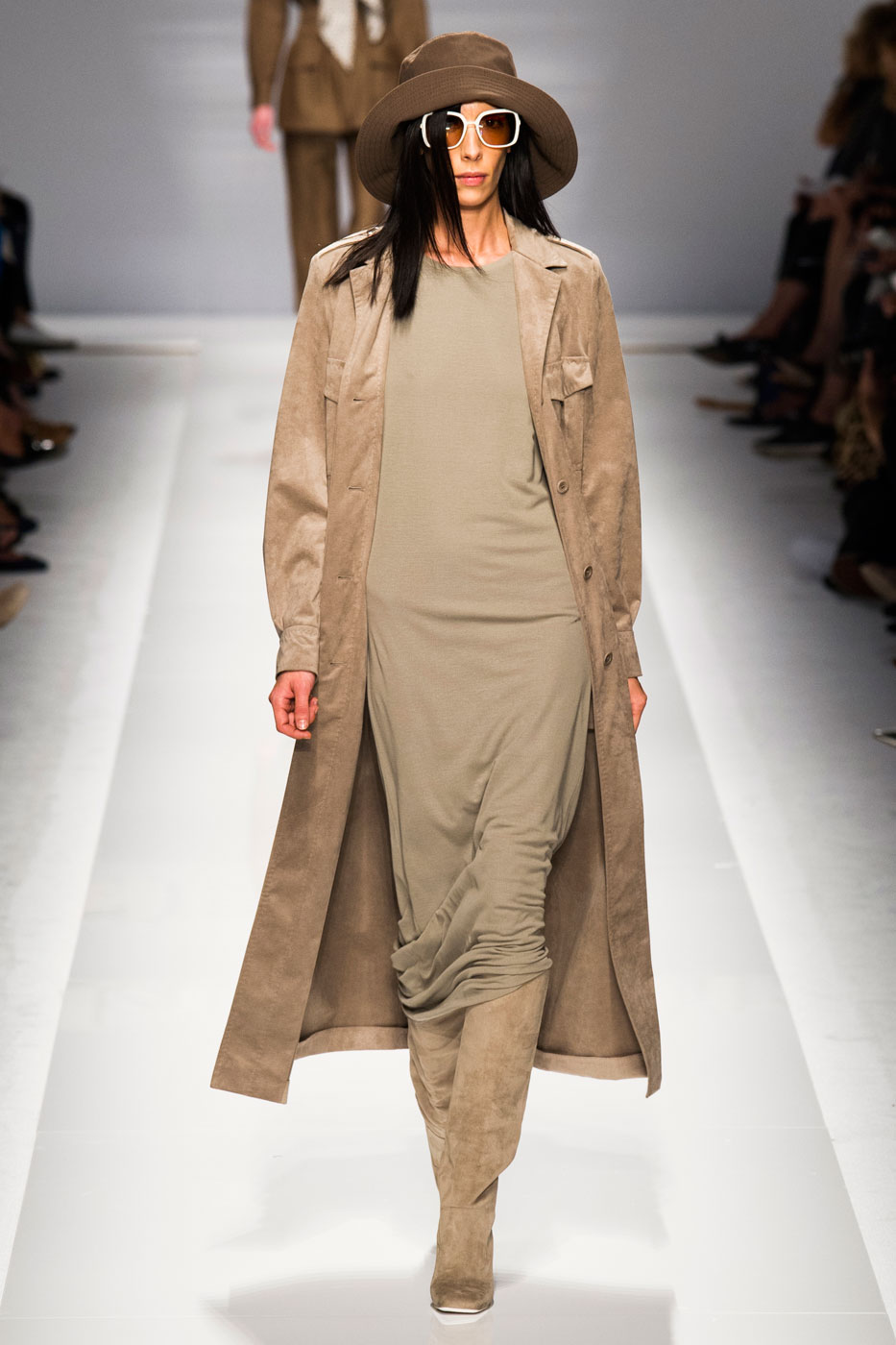 Max Mara представил очень утонченную и элегантную коллекцию, вдохновленную богемными 70-ми. Девушки носят наряды в горох и шляпы в стиле бохо, а развевающиеся штанины их брюк и комбинезонов плавно переходят в обувь. Тема хиппи представлена легко и ненавязчиво розовым платьем-халатом и зеленым комбинезоном с плащом. Приглушенная палитра Max Mara к концу шоу постепенно и вовсе слилась в черный, представив несколько гранжевых вещей и снова, как и на лондонской Неделе моды, с прозрачными топами.