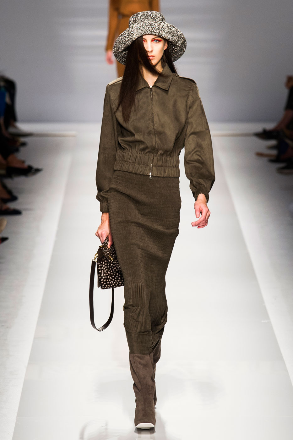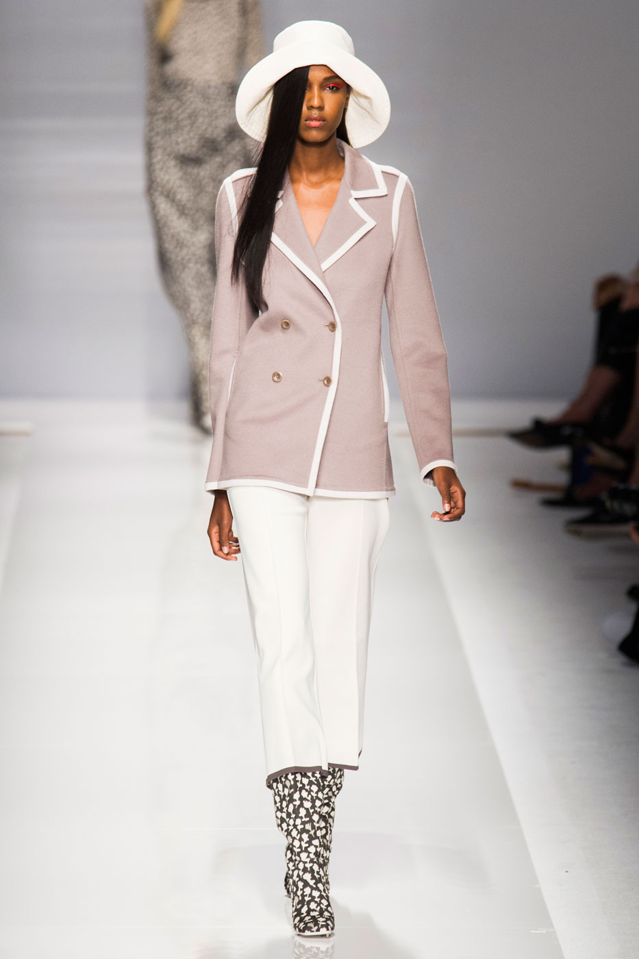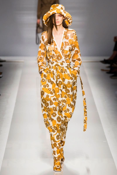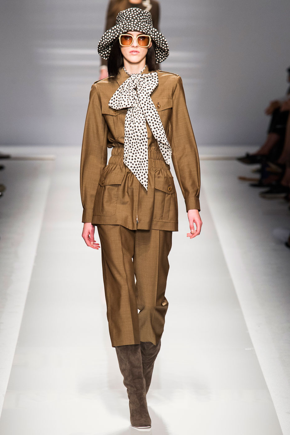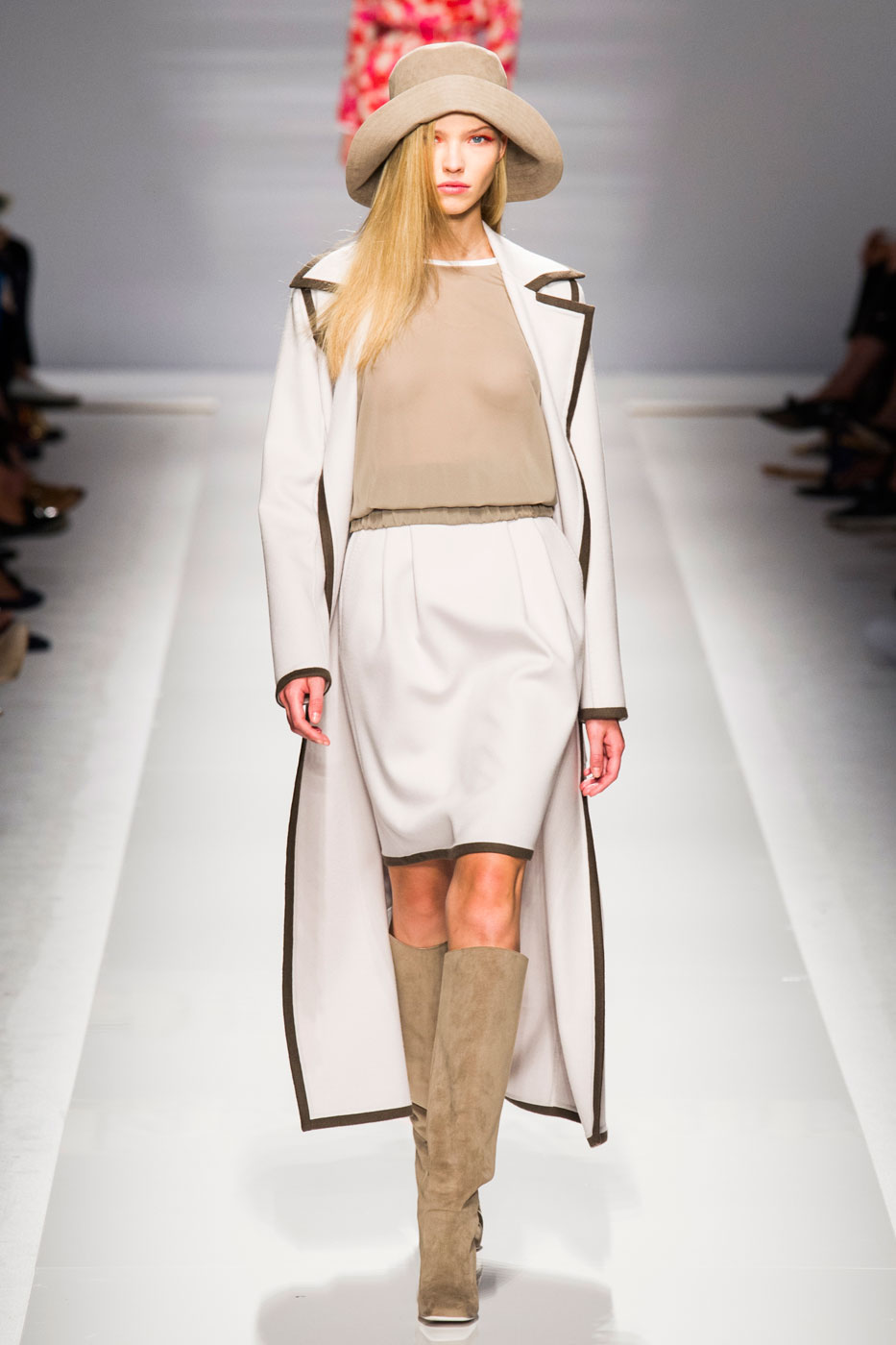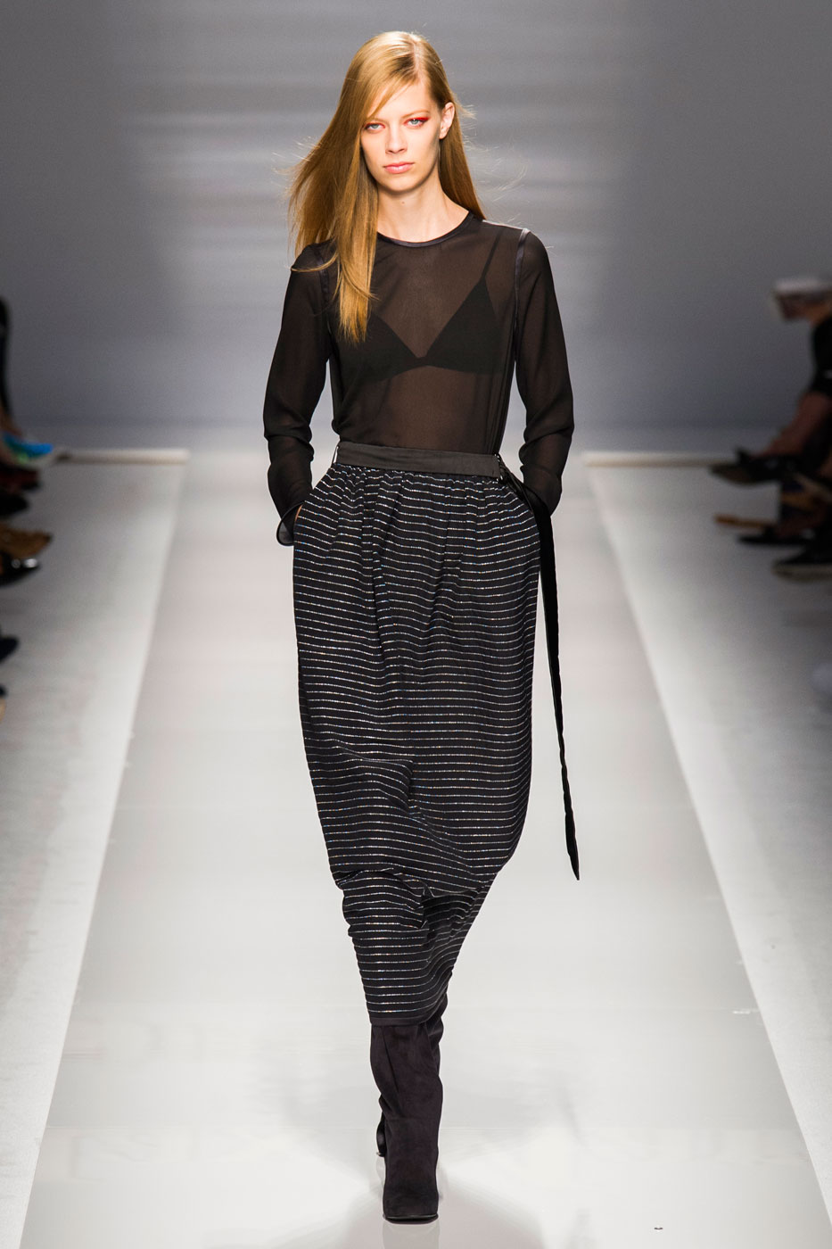 Max Mara представил очень утонченную и элегантную коллекцию, вдохновленную богемными 70-ми. Девушки носят наряды в горох и шляпы в стиле бохо, а развевающиеся штанины их брюк и комбинезонов плавно переходят в обувь. Тема хиппи представлена легко и ненавязчиво розовым платьем-халатом и зеленым комбинезоном с плащом. Приглушенная палитра Max Mara к концу шоу постепенно и вовсе слилась в черный, представив несколько гранжевых вещей и снова, как и на лондонской Неделе моды, с прозрачными топами.