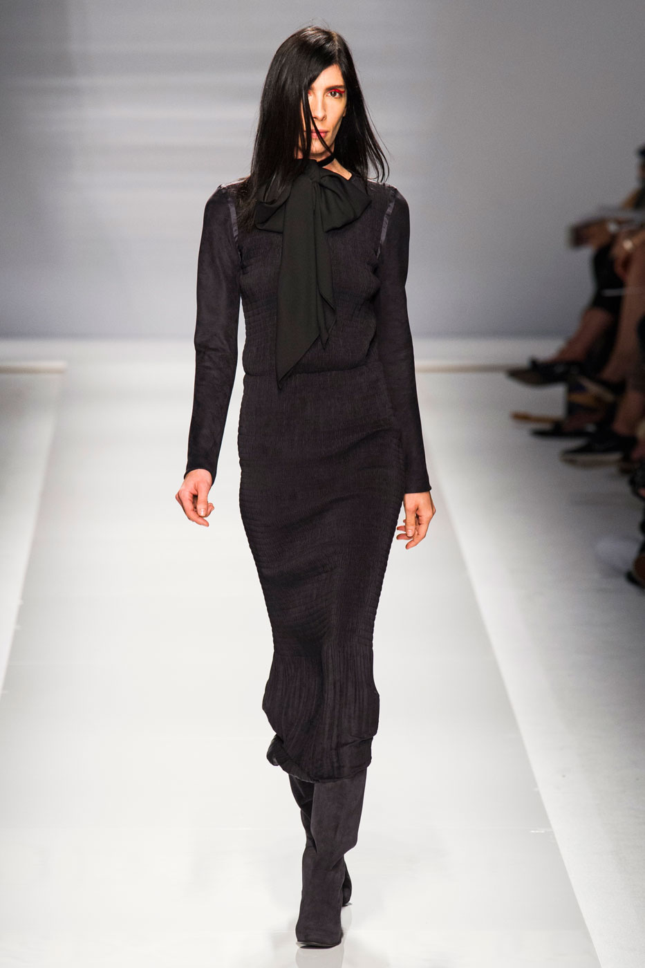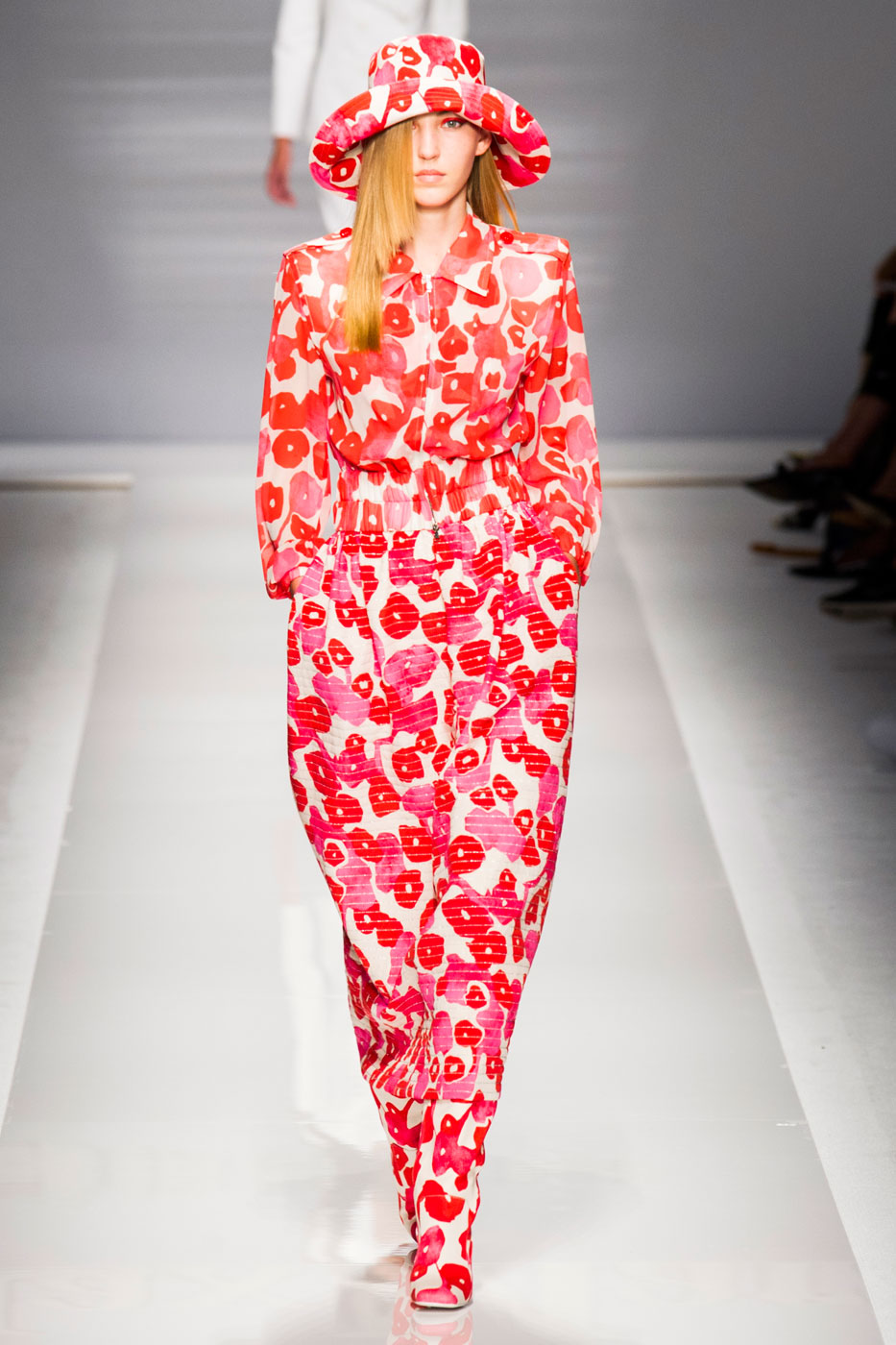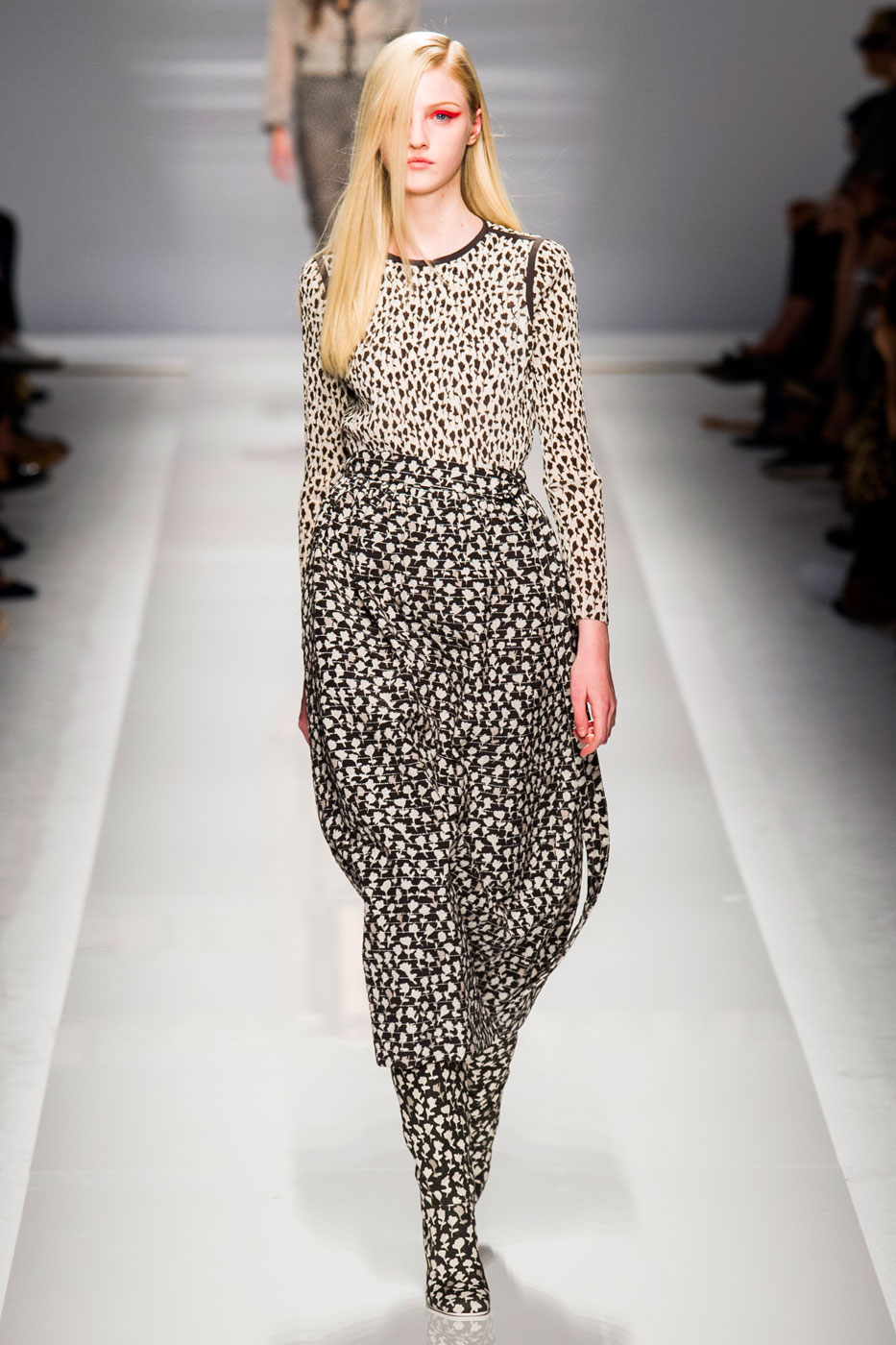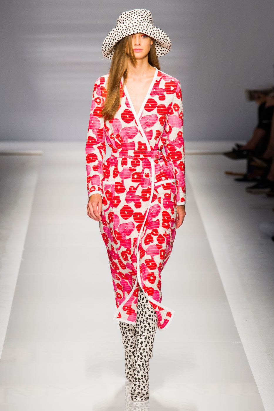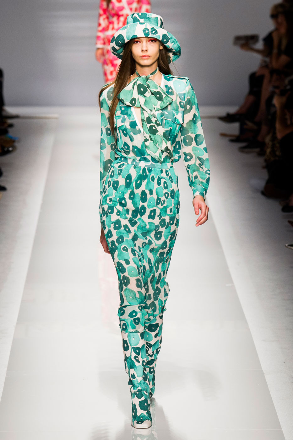 Max Mara представил очень утонченную и элегантную коллекцию, вдохновленную богемными 70-ми. Девушки носят наряды в горох и шляпы в стиле бохо, а развевающиеся штанины их брюк и комбинезонов плавно переходят в обувь. Тема хиппи представлена легко и ненавязчиво розовым платьем-халатом и зеленым комбинезоном с плащом. Приглушенная палитра Max Mara к концу шоу постепенно и вовсе слилась в черный, представив несколько гранжевых вещей и снова, как и на лондонской Неделе моды, с прозрачными топами.