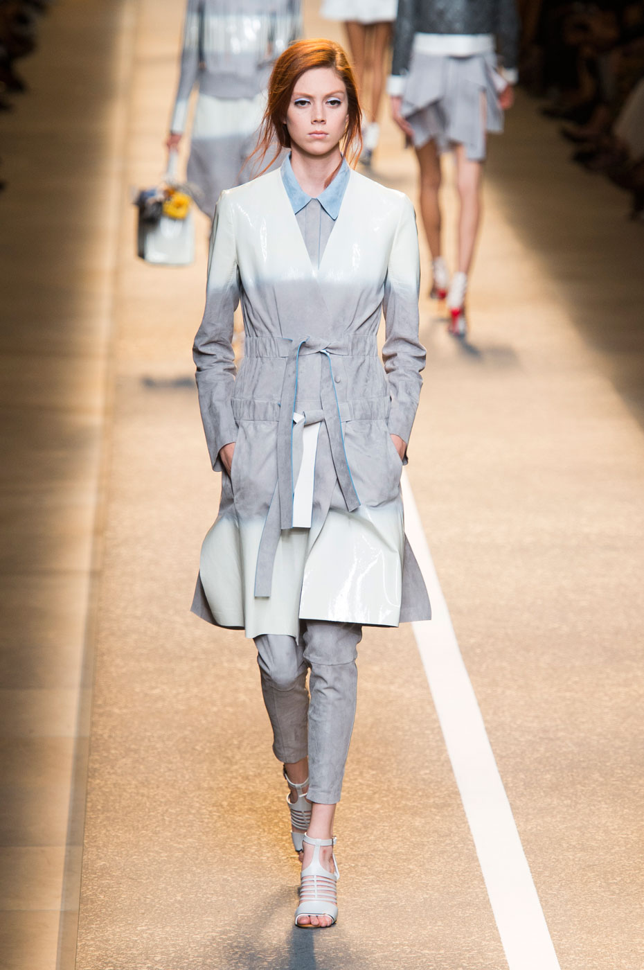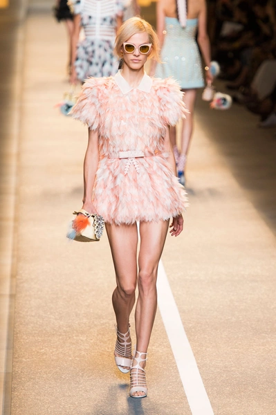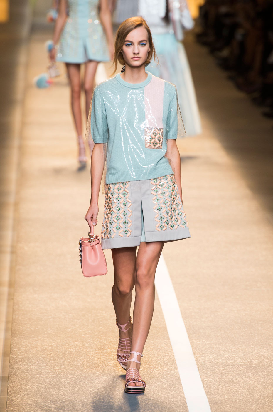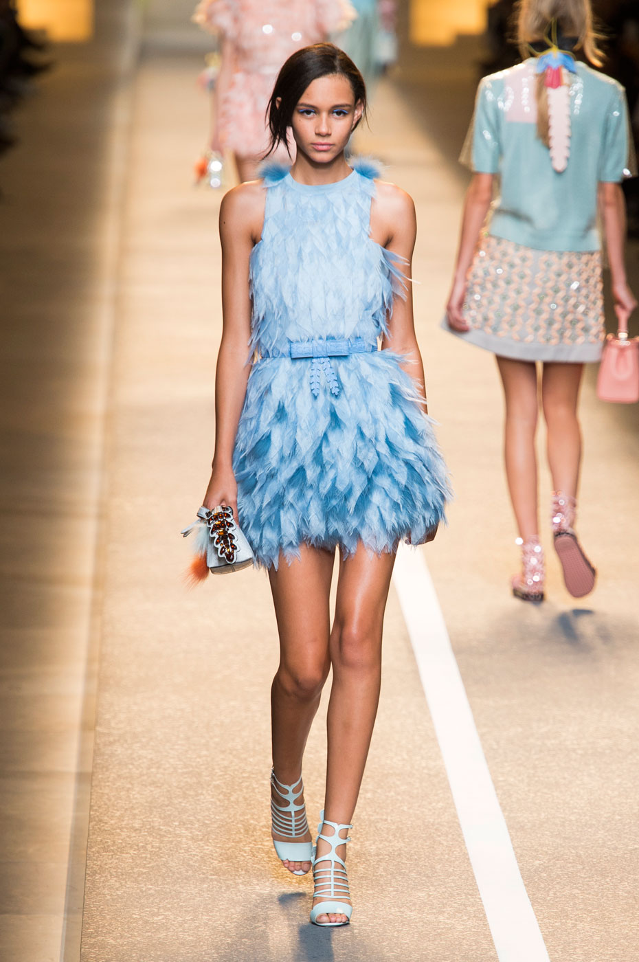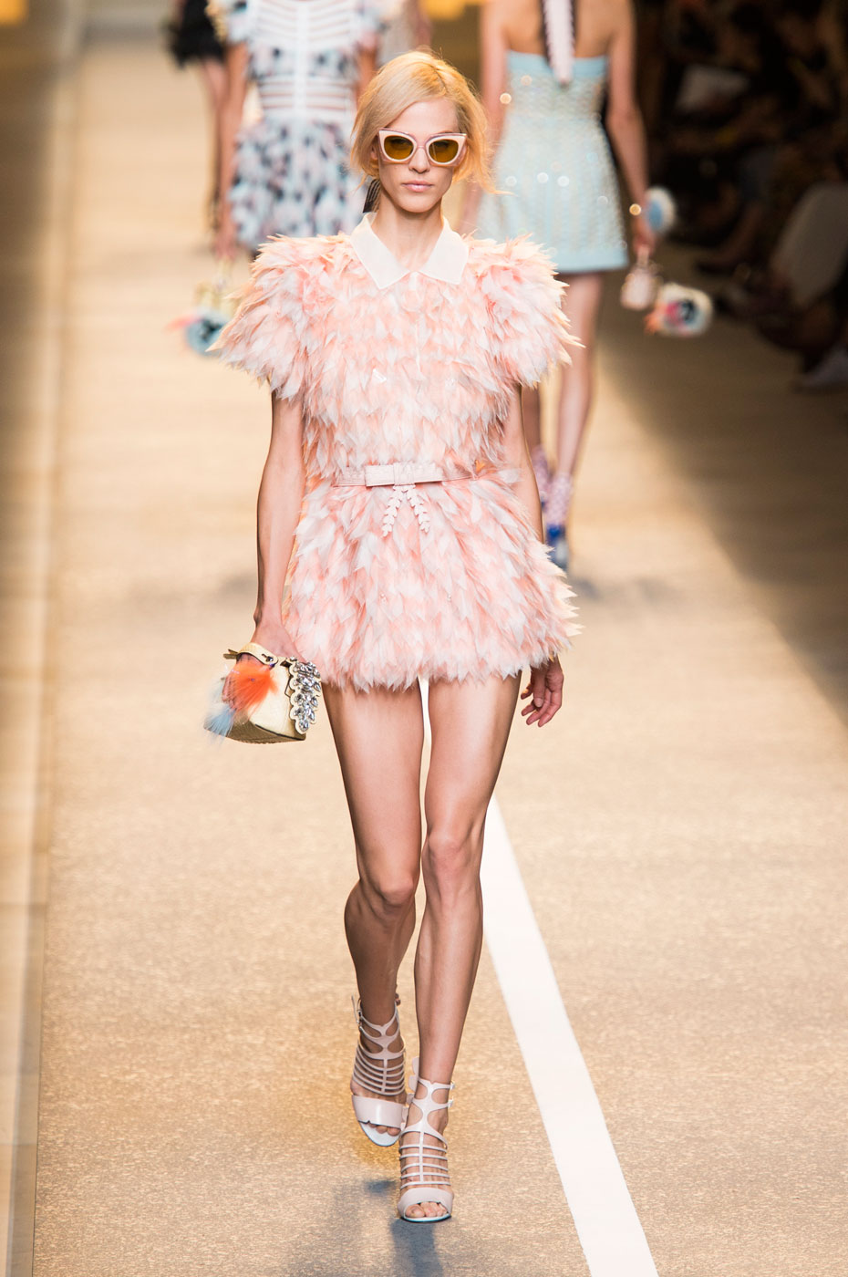 Сильвия Вентурини Фенди рассказала, что палитра новой коллекции вдохновлена цветом неба во время дождя, которое можно увидеть из Колизея. Гладиаторская тема и дальше прослеживалась в коллекции: модели носили поверх брюк черные юбки, открывающие переднюю часть ног, а позже и платья с имитацией гладиаторских доспехов. Карл Лагерфельд посчитал, что одним из символов дома Fendi должна стать орхидея, и поместил ее в виде узоров на платья, блузки и рубашки, а на черных жакетах и белых нарядах цветы распустились по-настоящему – они были сделаны из объемных материалов. Завершилось шоу выходом девушек в пышных, но коротких платьях, расшитых перьями. Они выполнены в розовых, голубых и черных цветах.