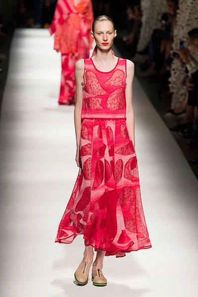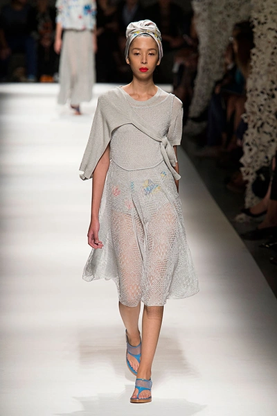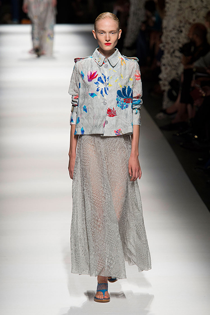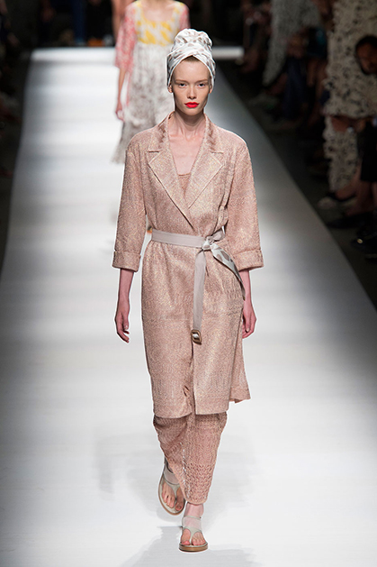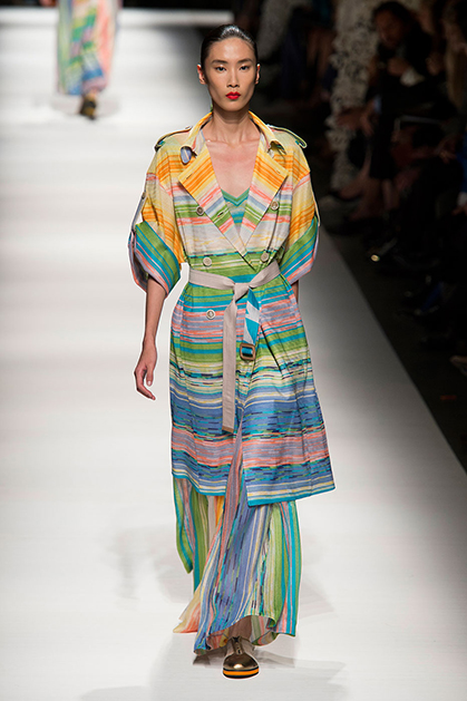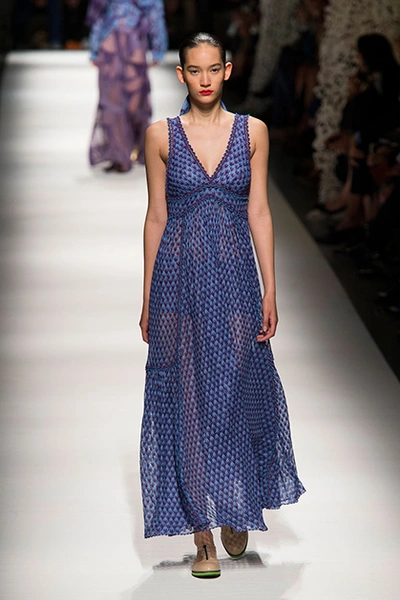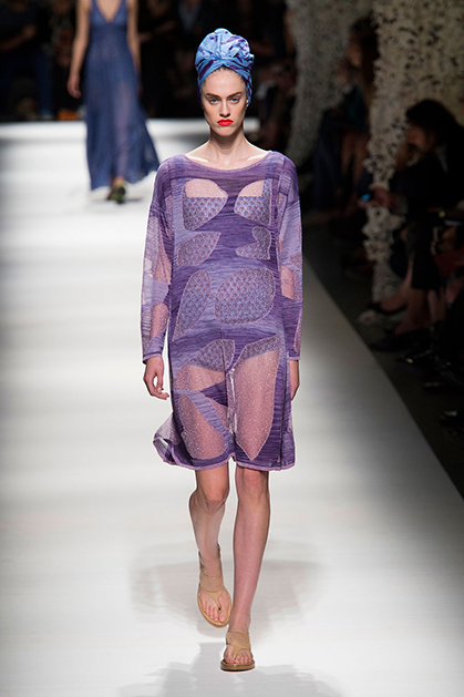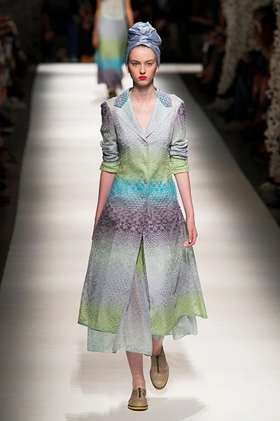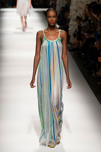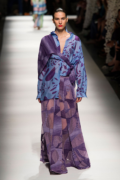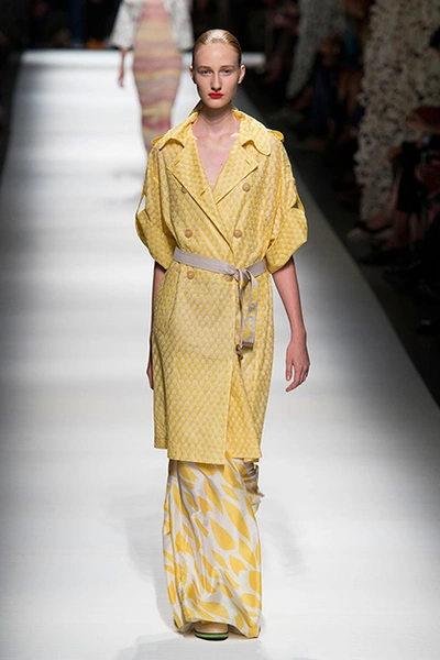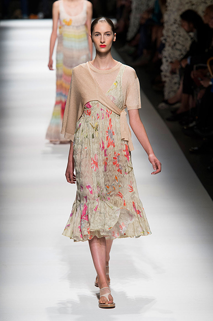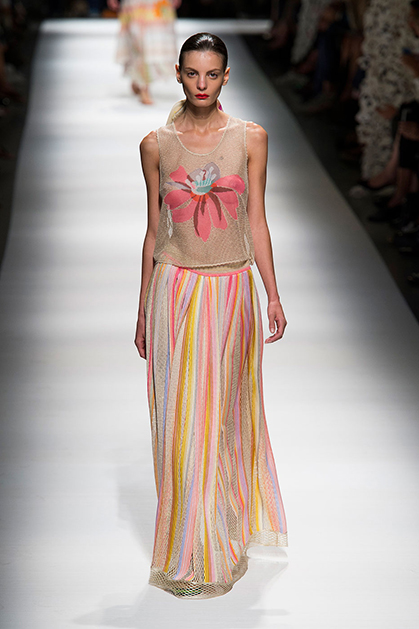 На своем показе Анджела Миссони продемонстрировала одну из самых романтичных коллекций сезона. «От рассвета до заката» – так ее уже прозвали критики за смену цветов одежды: от нежных, почти прозрачных и таких утренних до насыщенных, активных красно-желтых оттенков заката.
