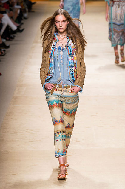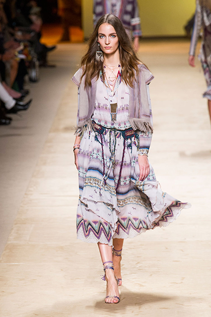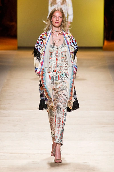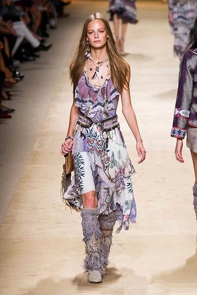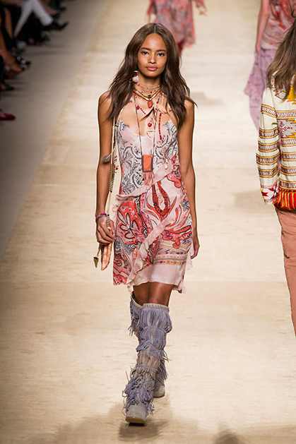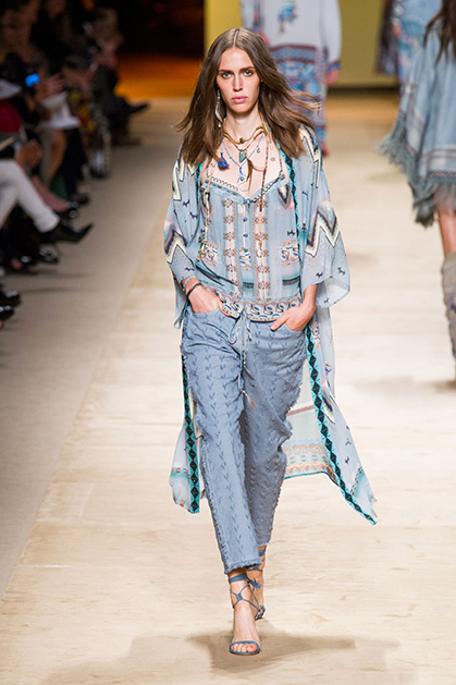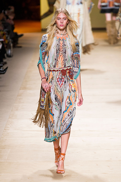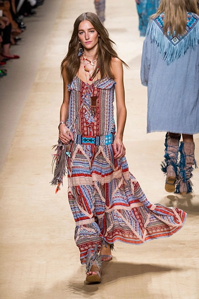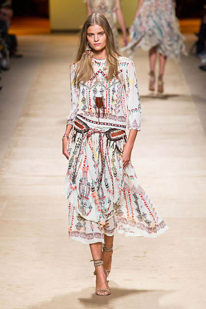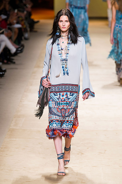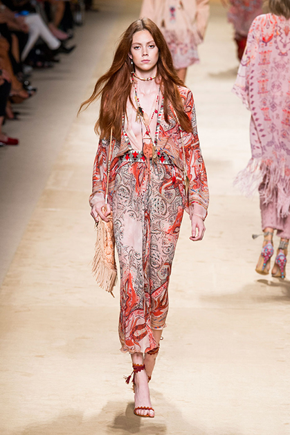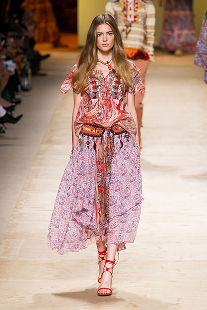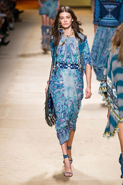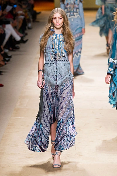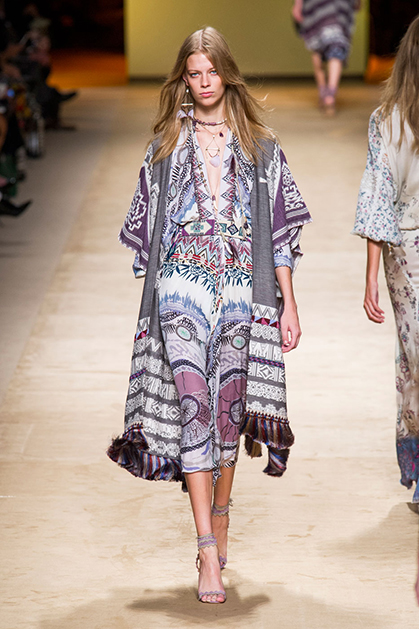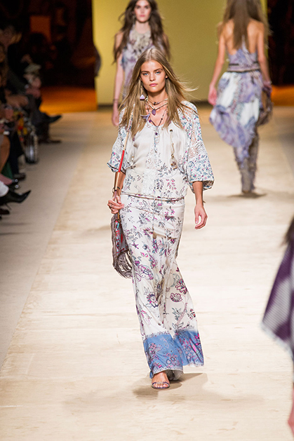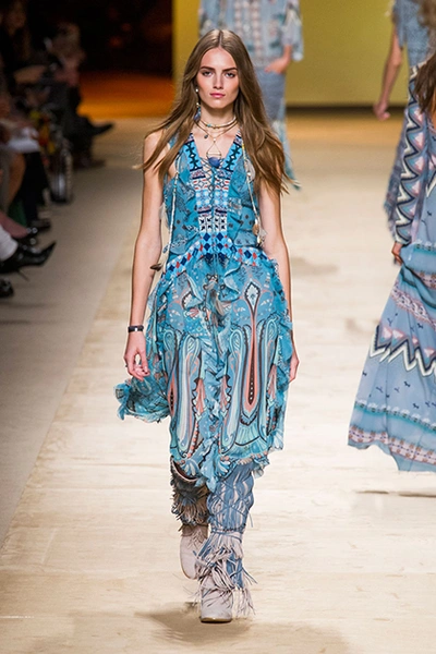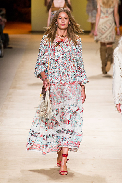 Дизайнер марки Etro Вероника Этро всегда отличалась любовью к ручной работе и вниманию к мельчайшим деталям, которые, собравшись вместе, создают невероятные шедевры. Весенне-летняя коллекция бренда – продолжение традиций. Все наряды, продемонстрированные моделями, создавались и украшались вручную. Несмотря на сложность работы, сама одежда получилась очень легкой, воздушной, игривой. На бохо, стиль 70-х и индийские мотивы Веронику вдохновила близость к природе «в ее самом диком проявлении».