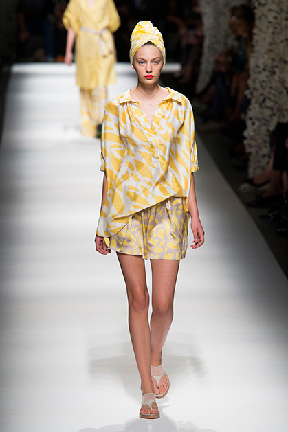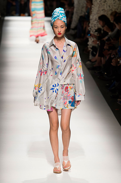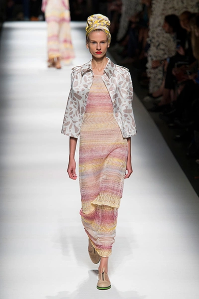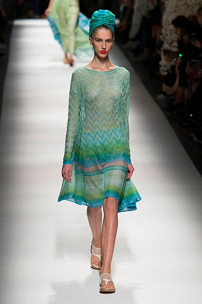 Образ девушки из весенне-летней коллекции Missoni – подчеркнуто небрежный, ненаигранный. Она повязывает мужскую рубашку поверх струящегося шелкового платья в пол и чувствует себя королевой дня. Восточный колорит в образах создавали необычные головные уборы – тюрбаны.