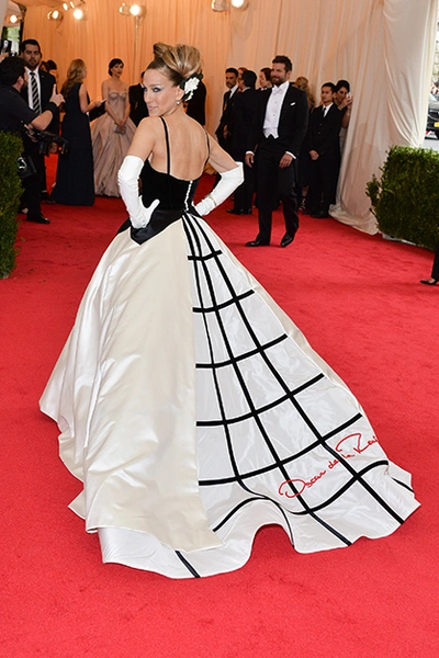 Сара Джессика Паркер. Однажды актриса появилась в платье от кутюрье с вышитым красными нитями логотипом на юбке на Балу института костюма. Как сказала сама Паркер, вышить логотип было её идеей - из желания отдать дань своему любимому дизайнеру. Сам Оскар де ла Рента никогда бы не стал этого делать, он был очень скромным.