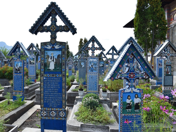 В городе с населением 5000 человек на севере Румынии находится одно из самых популярных туристических мест страны — «Веселое кладбище». Каждая из нескольких сотен могил на нем украшена резным дубовым крестом небесно-голубого цвета, на котором изображены сцены из жизни покойного, а иногда даже выгравированы стихи (в том числе, посвященные выпивке, авантюрным приключениям усопшего или даже шуткам о его свекрови). Создатели памятников применили всю свою фантазию и изобретательность, чтобы превратить обыкновенные могилы в «алтари жизни».