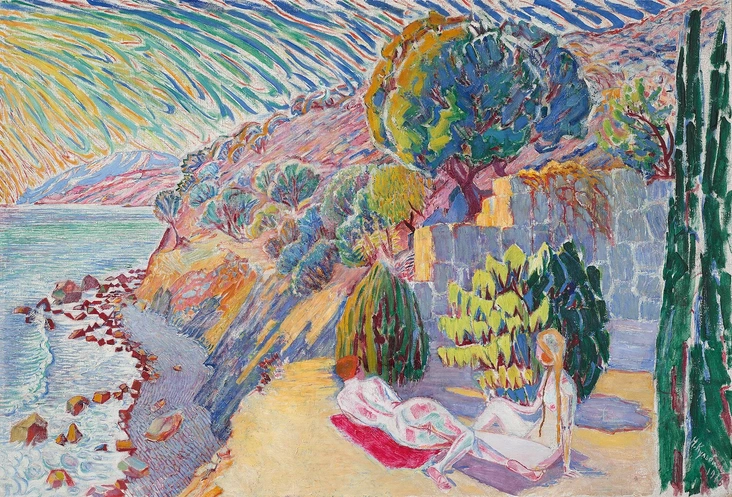 «Вождь петербургских импрессионистов» Николай Кульбин в 1900-е годы знакомил столичную публику с современным искусством. Адепт передовых художественных идей, он включал в свои работы и фовистские приемы. В картине «Солнечная ванна», название которой звучит как один из пунктов «Списка обязательных дел на лето», природа Крыма преображается под взглядом Кульбина, и лучи палящего солнца начинают играть розовыми, фиолетовыми и голубыми цветами.