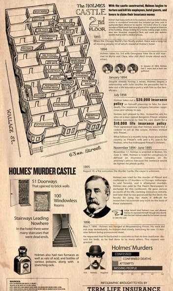 Когда строительство было завершено, Холмс притупил к осуществлению своих планов — его первыми жертвами были женщины, которые устраивались к нему на работу с условием обязательного страхования жизни (естественно, после их смерти от рук Холмса, страховые выплаты отправлялись в его карман). Впрочем, убийце было недостаточно одного лишь богатства — он был садистом и хотел использовать возможности отеля для осуществления своих злодеяний.