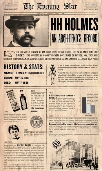 Стоит отметить, что Генри Холмс был весьма обаятельным мужчиной — он обладал отличными манерами, хорошо одевался, умел вести себя в обществе и поддерживать беседу. Благодаря своим навыкам он легко втирался в доверие к людям — в разное время он совершил несколько афер, принесших ему неплохие деньги, однако Генри было недостаточно этого — он мечтал о настоящем богатстве и роскошной жизни.