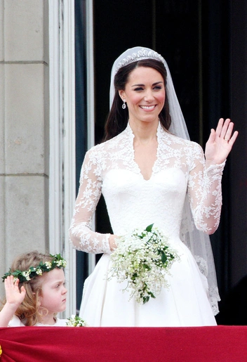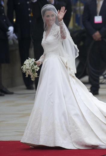 В тот день Кейт блистала в роскошном кружевном платье Alexander McQueen — его для будущей принцессы разрабатывала дизайнер Сара Бертон. За невестой тянулся трехметровый шлейф и длинная фата, спадавшая ниже коленей. Также этот день Кэтрин впервые надела тиару. Роскошное украшение Cartier Halo с 888 бриллиантами ей подарила лично королева Елизавета.