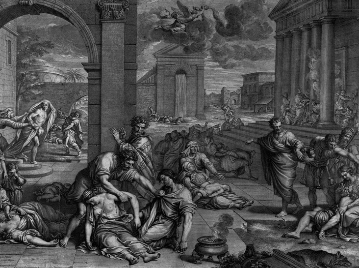 Пандемия Юстиниановой чумы, названной в честь императора Юстиниана I, началась в 541 году на территории Египта. Переносчиками инфекции были крысы, которые жили буквально на каждом судне, в том числе и на тех, что перевозили зерно в Константинополь и другие точки земли. Именно так началось массовое заражение — уже через месяц пандемия накрыла Италию, Испанию, Германию, Галлию, Британию, Сирию, Месопотамию. По оценкам историков, в 543 году в столице Римской империи от Юстиниановой чумы ежедневно умирало около пяти тысяч человек.