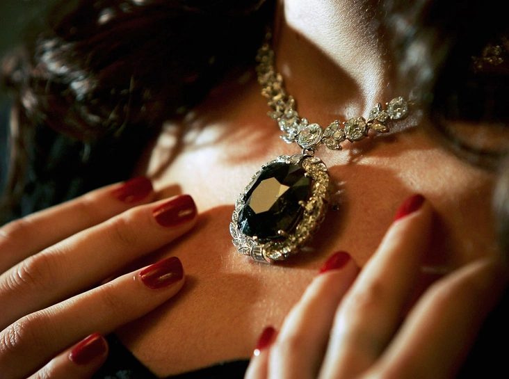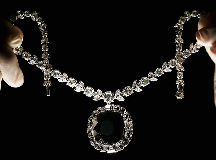 Завораживающая красота, редкий цвет и внушительный размер — это всего лишь поверхностное описание этого печально известного «проклятого» камня. Словно серийный маньяк, он «убивал» своих владельцев многие века. Началась его кровавая история в XVII веке в Индии. Синий бриллиант с фиолетовым отливом сразу же привлек внимание путешественника и торговца драгоценностями Жана Батиста Тавернье. В 1668 году он привез камень во Францию, где продал королю Людовику XIV, который по достоинству оценил всю прелесть этого уникального алмаза. Жан Батист также рассказал монарху легенду, которая сопровождала завораживающий своей красотой камень — она гласила, что этот алмаз был глазом индийского бога Рамы. Вот только торговец опустил тот факт, что имелся в виду не правый глаз (исцеляющий и помогающий), а левый (карающий и разрушающий).