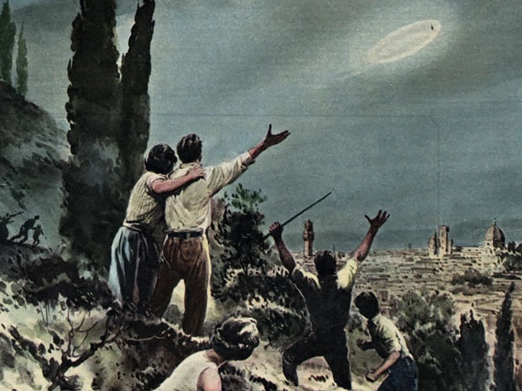 В этот осенний день 1954 года на флорентийском стадионе Артемио Франки собралось около 10 000 футбольных болельщиков. Они с азартом наблюдали за игрой между знаменитой «Фиорентиной» и ее местным конкурентом «Пистойезе». Но неожиданно на трибунах воцарилась тишина и тысячи глаз поднялись в небо. Матч тоже остановился: игроки обеих команд стояли на поле, показывая пальцами вверх. Среди них был и Ардико Маньини — известный итальянский футболист, представлявший страну на чемпионате мира 1954 года. «Я запомнил все от А до Я, — рассказывал он впоследствии об увиденном на стадионе. — Это было что-то похожее на огромное яйцо, которое медленно проплывало у нас над головами. Все смотрели вверх, а с неба спускались серебряные нити…»