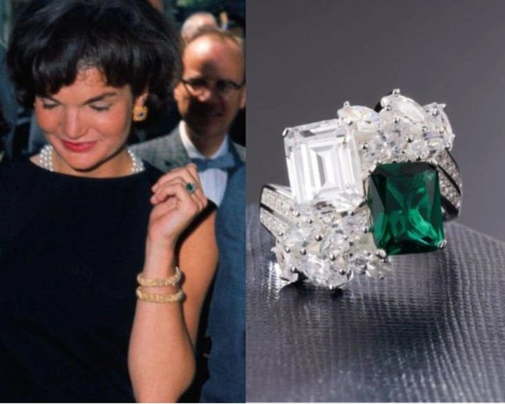 Cледующая помолвка и брак поместили Джеки в центр американской политической жизни. В июне 1953 года еще сенатор Джон Ф. Кеннеди сделал предложение с кольцом Van Cleef & Arpels с изумрудом 2,84 карата и бриллиантом 2,88 карата, установленными рядом на платиновой полосе. Согласно нескольким сообщениям, кольцо на самом деле было выбрано Джозефом Кеннеди, отцом Джона, а не самим женихом (читайте также: Скелеты в шкафу президента: на ком Джон Кеннеди был женат до Жаклин (и почему этот брак скрыли)).