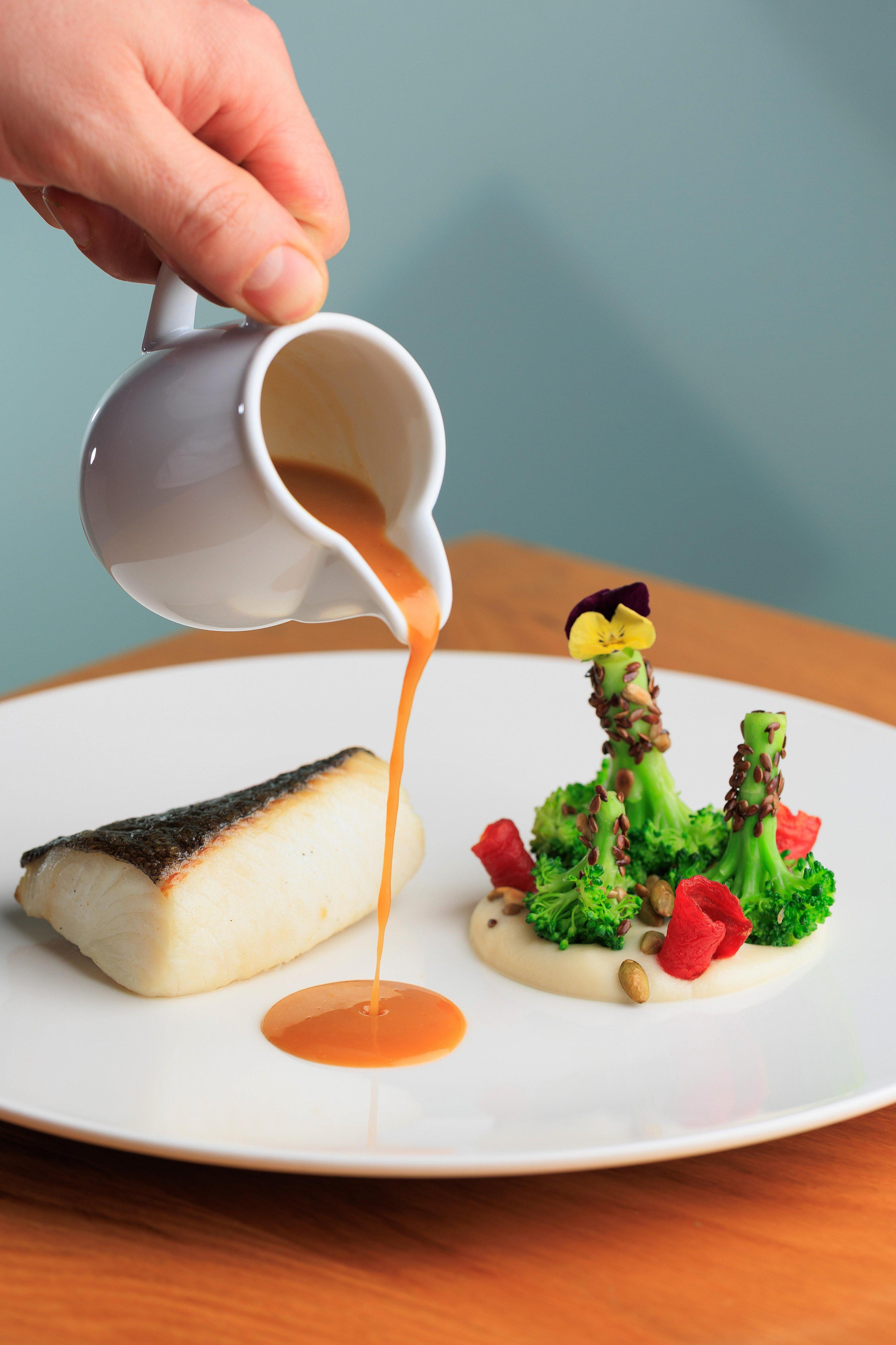 Черная треска с пюре из топинамбура и брокколи.