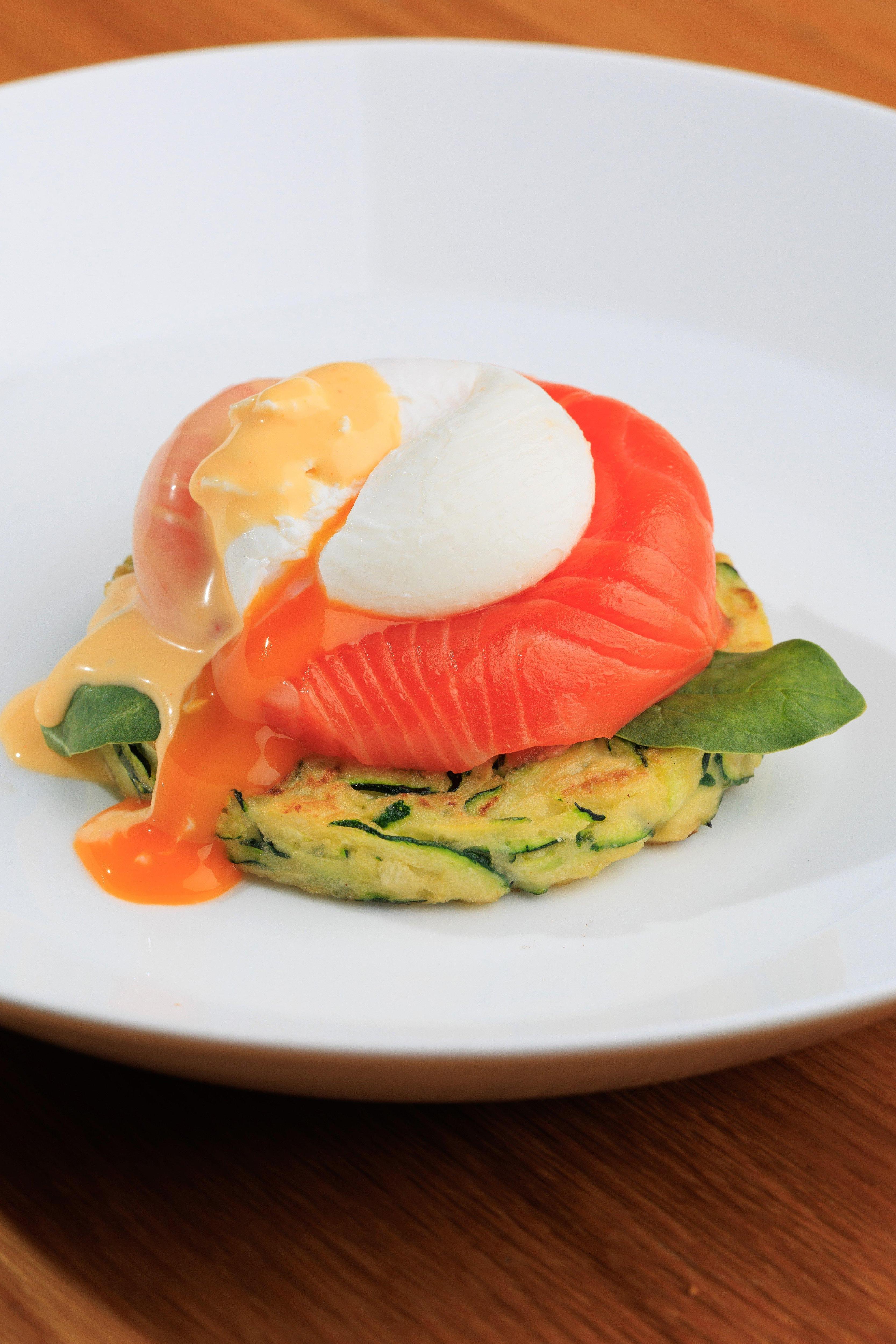 Горячие блюда представлены оладьями из кабачков с лососем слабой соли, яйцом пашот и голландским соусом на масле гхи, черной треской с пюре из топинамбура и брокколи, куриной грудкой в миндальной крошке с фаршированным перцем рамиро и кус-кусом.