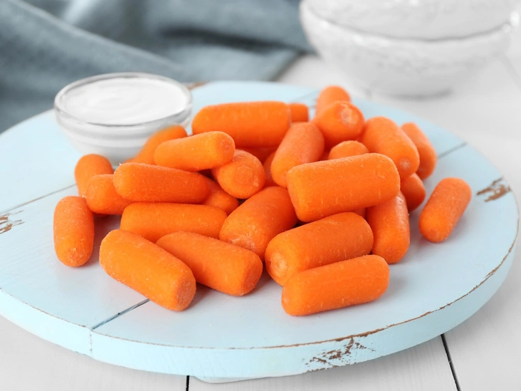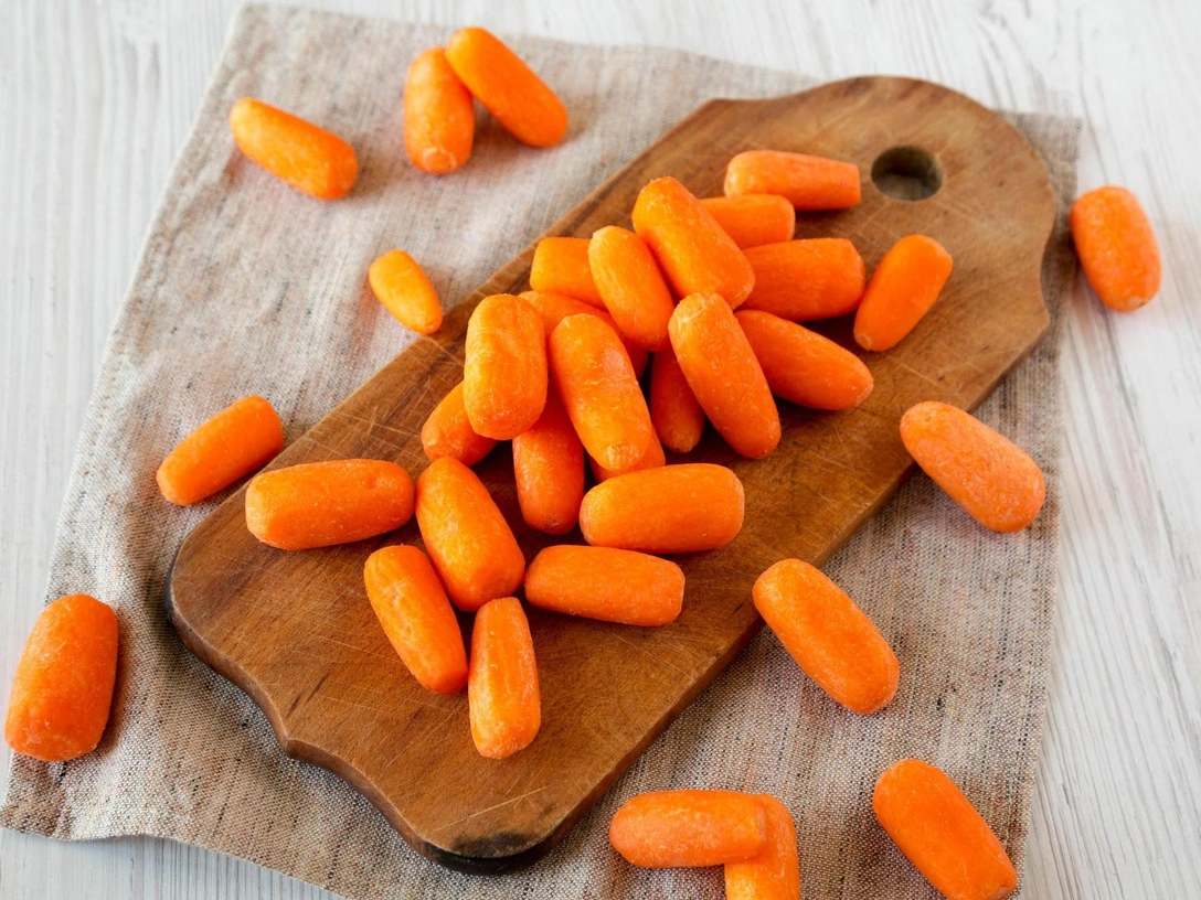 Мини-морковь на вкус не отличается от обычной, но более удобна как закуска, так как не потребует чистки, а еще ее можно запечь. На порцию из 10 маленьких морковок приходится 41 калория, 1,2 г белка, 8,2 г углеводов и 0 г жира.