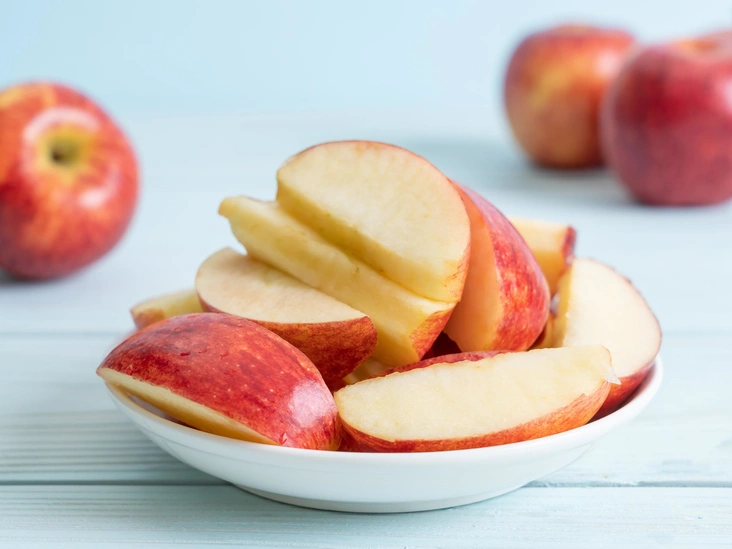 Порция из 9 долек яблока (примерно 100 г) красных яблок содержит 53 калории, 12,3 г углеводов, 0 г белка и 0 г жира.