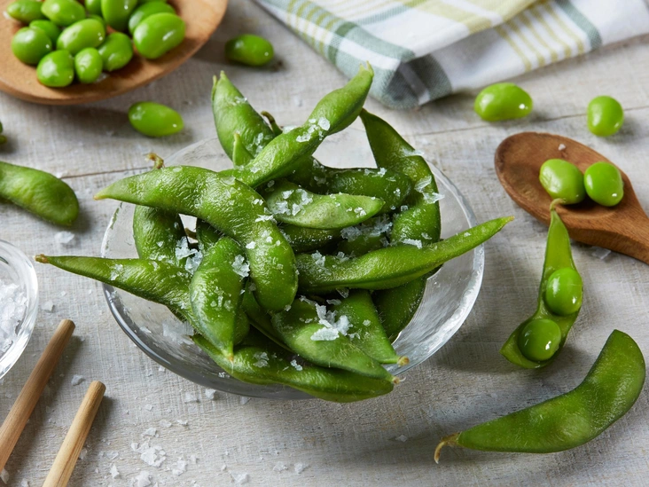 В порции эдамаме весом примерно в 100 г содержится 63 калории, 4,7 г белка, 6,3 г углеводов и 2 г жира. Учтите, что заправка из соевого соуса повысит калорийность.