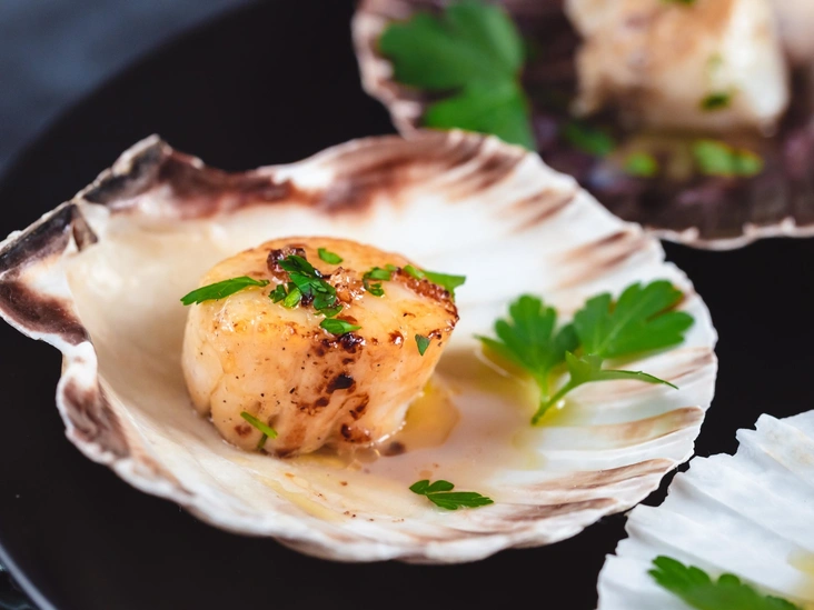 Порция, состоящая из 4-5 больших гребешков, 9-12 средних гребешков или 15-20 маленьких гребешков, содержит 89 калорий, в том числе 17 г белка, 2,7 г углеводов и 0,9 г жира.