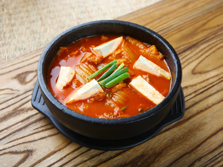Свинину нарезать небольшими кубиками, порубить лук и отправить ингредиенты в кастрюлю вместе с чили пастой, древесными грибами, сахаром и капустой кимчи. Добавить туда же воду и соевый соус, варить около тридцати минут, периодически помешивая. Далее отправить в кастрюлю порезанный тофу, довести до кипения и варить еще десять-пятнадцать минут на слабом огне (читайте также: 5 кухонных секретов, о которых вы могли не знать (или сомневались в их правдивости)).