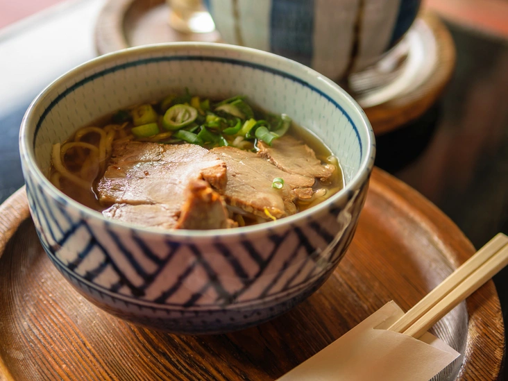 Когда свинина будет готова, вынуть ее из кастрюли и отправить на сковороду с соевым соусом и сахаром — жарить на сильном огне две-три минуты, постоянно помешивая. Далее отварить лапшу и «собрать» суп. Для этого в глубокую миску положить порцию лапши и свинины, порезанный лук и половинки яйца, залить бульоном.