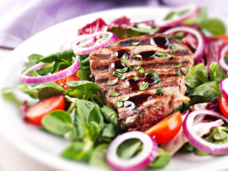 Второй рецепт салата предполагает использование вкусного сочного стейка (в нем минимум углеводов!).