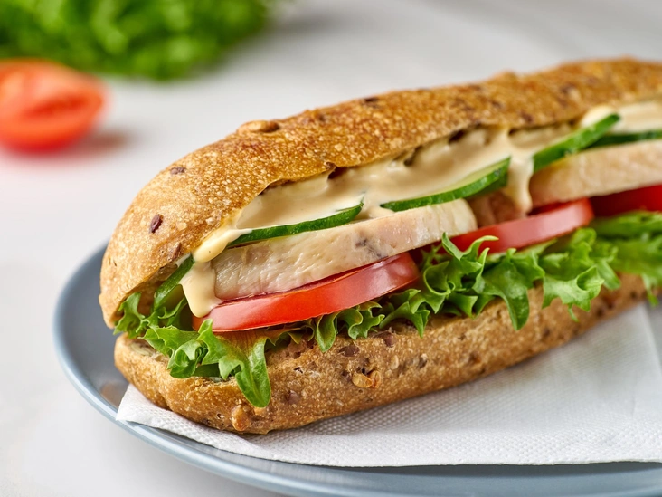 На «сборку» такого сэндвича вам понадобится не более пяти минут, не считая приготовления куриного филе. Прожарьте его на гриле, отварите либо запеките в духовке. Порежьте ломтики сыра, помидоры и листья салата. Намажьте два кусочка хлеба соусом. На нижний положите сыр и куриное филе, на верхний — салат и слайсы помидора. И не забудьте про свой кофе!