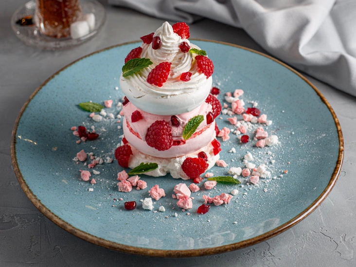 Гранатовый мармелад нарезать мелкими кубиками. На тарелку с помощью кондитерского мешка с рифленой насадкой отсадить немного гранатового крема. Выложить безе, на него нанести крем. Повторить процедуру еще раз. Посыпать кубиками мармелада и крошками безе. Украсить малиной и листьями мяты.