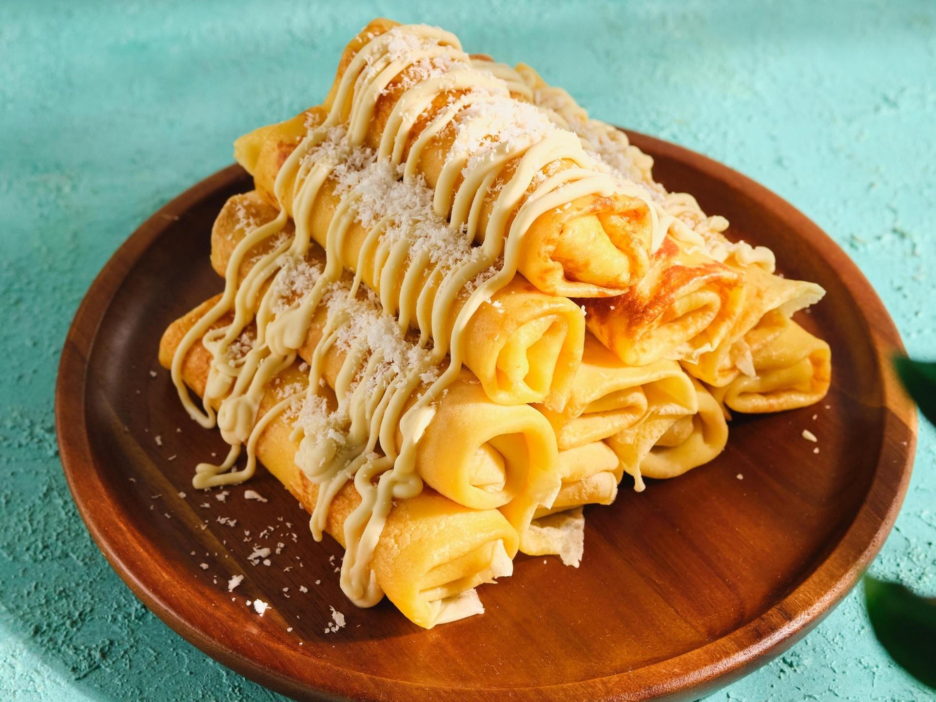 Начините блины. Для этого выложите начинку на блин, подверните его края к центру и скрутите в рулет. Перед подачей нужно полить блюдо остатками сгущенки и посыпать кокосовой стружкой.