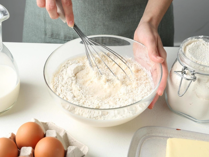 В миске взбейте яйца с сахаром и солью. После этого влейте в туда же молоко и смесь из матчи, тщательно перемешайте. Добавьте просеянную муку. Если тесто будет получаться слишком жидким, добавьте еще немного муки.