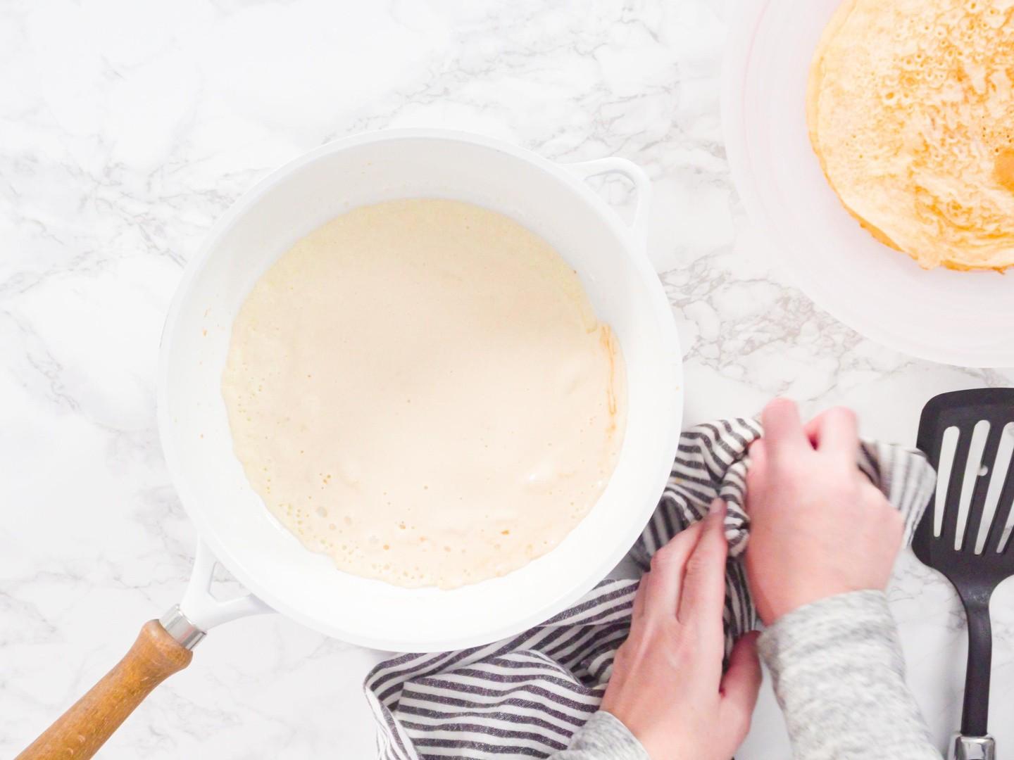 По очереди испеките все блины. Постарайтесь делать их тонкими и покрытыми легкой золотистой корочкой.