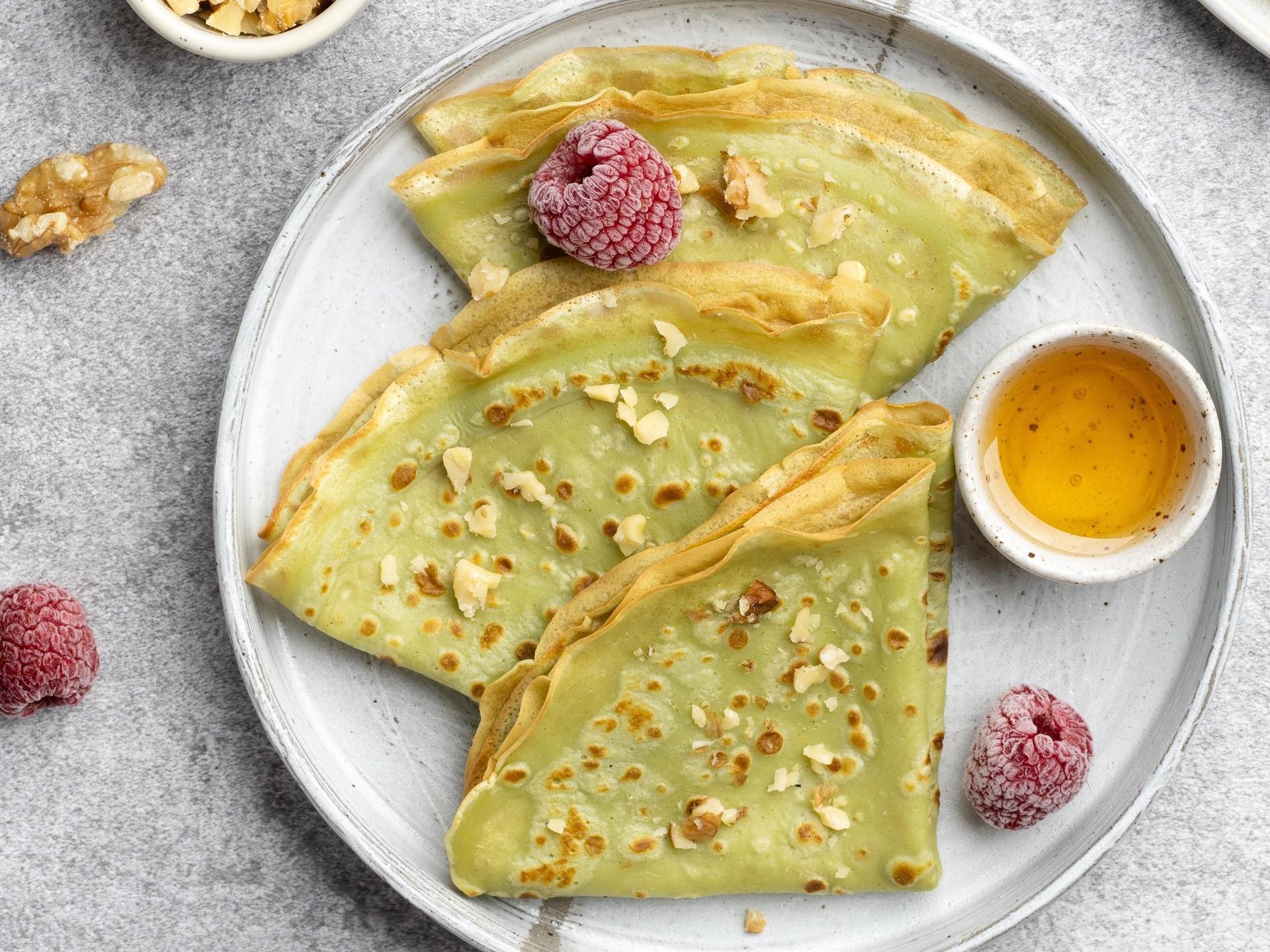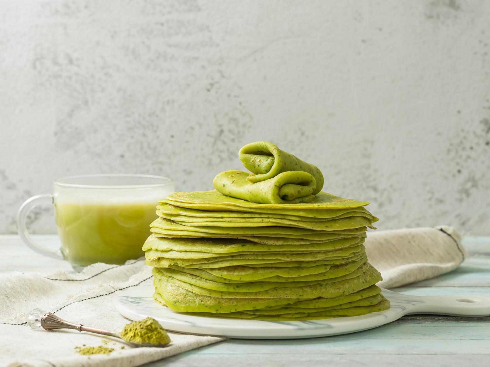 Еще один трендовый рецепт этого года — блины, вдохновленные самым популярным напитком. Благодаря матче в составе они приобретают тонкий вкус зеленого чая и насыщенный цвет. Особенно хороши для сладких начинок и блинных тортов (читайте также: Чай матча: чем он полезен, и как его пить (плюс 3 лучших рецепта)).