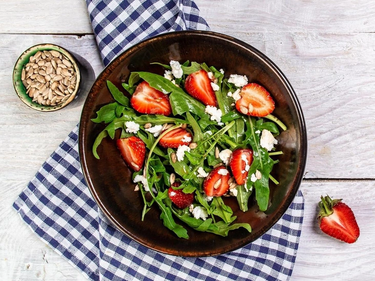 1/2 ч.л.Промойте ягоды и выложите на бумажное полотенце. Уберите у клубники хвостики и разрежьте на четвертинки, а малину оставьте целой. Смешайте ягоды в салатнице с миндальными лепестками, измельченной рукколой и щедрой одного лимона. Приправьте солью по вкусу.