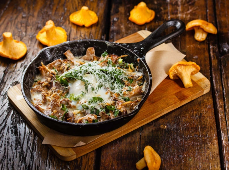 Приготовить на пару лисички, отварить телячье сердце в течение 1 часа. На масле обжарить репчатый лук, добавить лисички — слегка обжарить, влить бульон, положить сердце — протушить. Влить сливки и готовить пока соус не затянется.