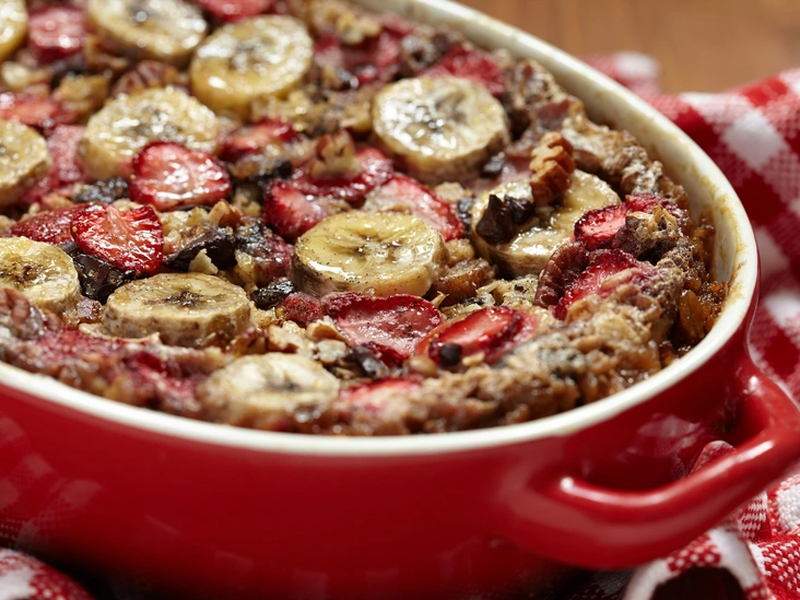 Выложите половину получившегося овсяного теста на дно небольшой формы для запекания. Сверху положите фрукты (включая банановое пюре), а третьим слоем выложите оставшуюся овсяную смесь.
