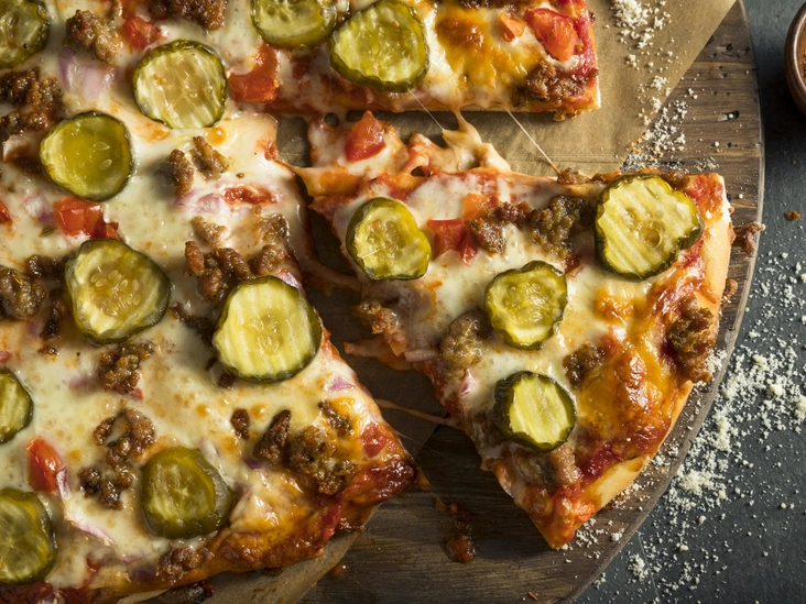 Гамбургеры или чизбургеры любят практически все, но привычный формат может надоесть (читайте также: Пальчики оближешь: 4 лучших рецепта домашних бургеров). Однако это не проблема, ведь можно съесть бургер в виде пиццы. По вкусу вы практически не найдете отличий за счет правильно подобранного сочетания ингредиентов: фарш из говядины, чеддер, моцарелла, маринованные огурцы, томаты, лук и, конечно, соусы барбекю и томатный. Тем более, что любимый вкус в виде пиццы безопаснее для фигуры — начинка подается на тонком тесте, а не с булками.