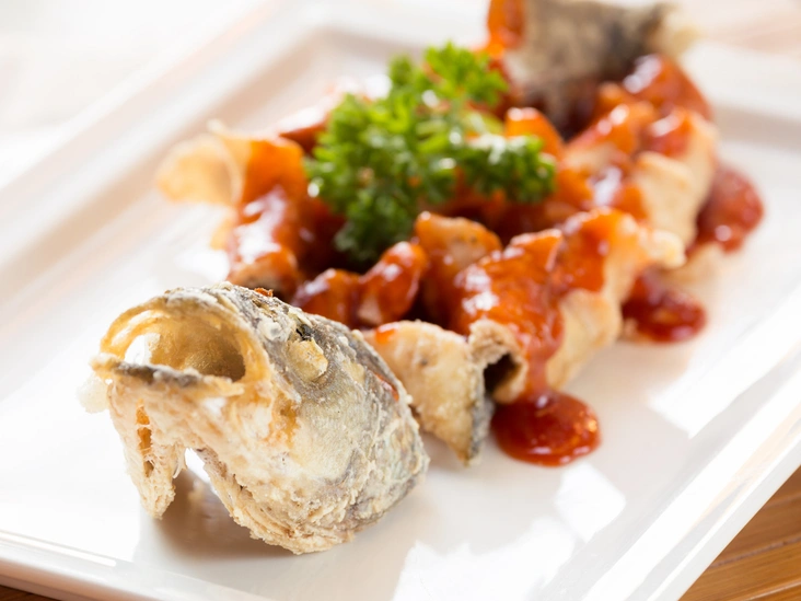 Разделайте рыбу на филе, а затем аккуратно сделайте надрезы до кожи, тем самым убрав все кости. Далее приготовьте маринад, смешав яйца и специи, и обваляйте филе судака сначала в нем, а затем в крахмале. Жарьте во фритюре с большим количеством масла до золотистой корочки.