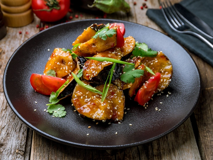 Рецепт баклажанов в остром соусе пришел к нам из китайской провинции Сычуань, для кухни которой характерны необычные вкусовые сочетания — в этом рецепте как раз присутствуют и соленые, и кисло-пряные, и острые нотки. Блюдо является прекрасным сытным гарниром, а соус передает настоящее пристрастие азиатской культуры к острым блюдам.